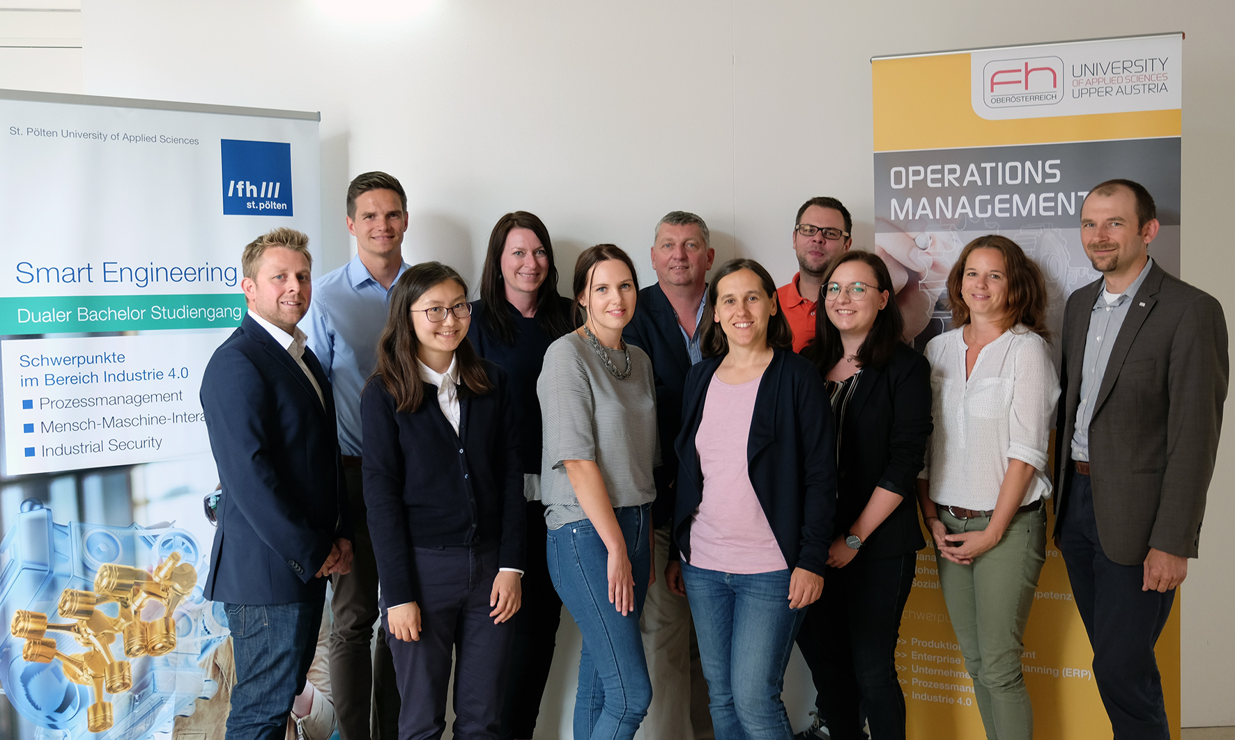 Thomas Felberbauer, FH St. Pölten (links außen) und Klaus Altendorfer, FH OÖ (rechts außen) mit dem Projektteam. Credit: FH OÖ / Andreas Schober