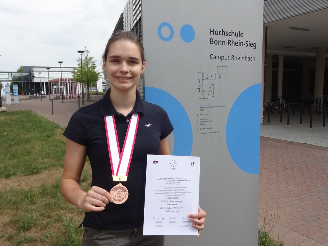 Jenny Warling, luxemburgische Karatesportlerin und kurz vor Abschluss des Masterstudiums Analytische Chemie und Qualitätssicherung an der Hochschule Bonn-Rhein-Sieg (H-BRS), hat bei der Studentenweltmeisterschaft in Kobe/Japan die Bronzemedaille gewonnen. Ihre Disziplin im Karate ist das Kumite, ihre Gewichtsklasse -55 kg.