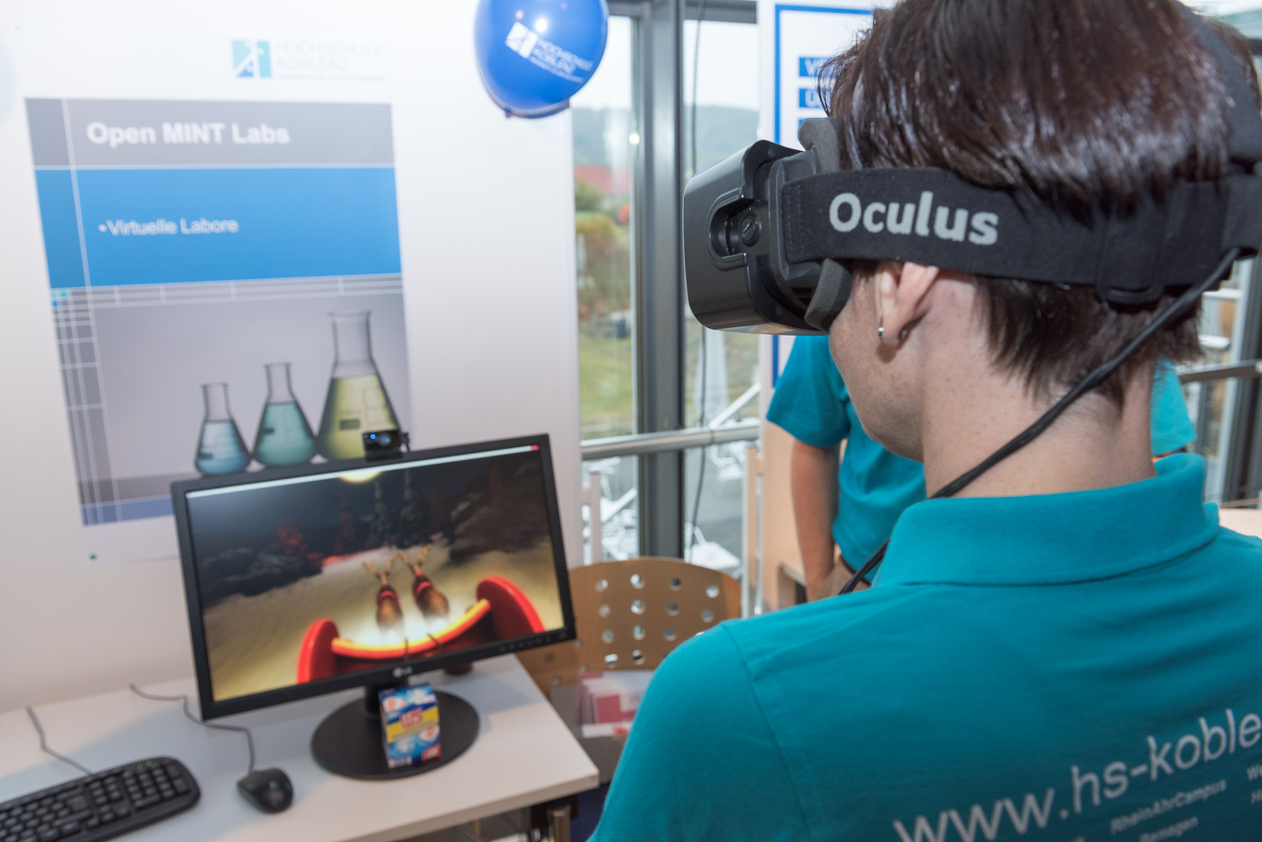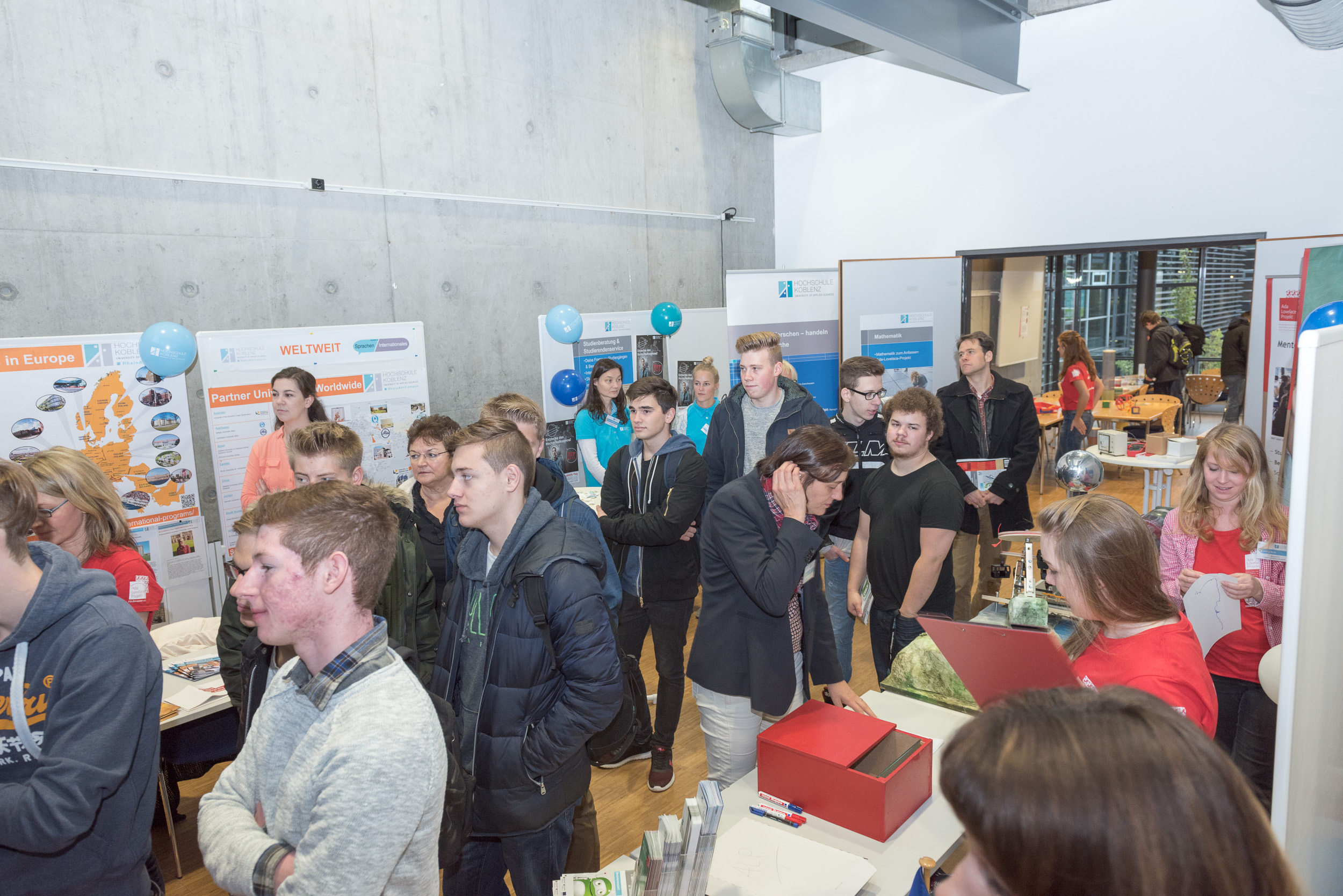 Im Foyer versetzen 3D-Drucker, Spannungsanalysen oder die Leonardo-Brücke und andere technologische Highlights die Zuschauer in Erstaunen. Ausstellungen von Architektur über Elektrotechnik bis hin zur High-Tech-Keramik zeigen die große Bandbreite der spannenden Technikwelt. Das namhafte Unternehmen Thyssen Krupp Rasselstein veranschaulicht unter anderem die MINT-Welt im Arbeitsleben. Zahlreiche weitere Stände aus den Fachbereichen laden zum Anfassen und Mitmachen ein. Und in den Schnupperlaboren können sich die Schülerinnen und Schüler schon mal wie richtige Studierende fühlen und selbst zu Wissenschaftlern werden, indem sie beispielsweise eine Smartphone-Boom-Box löten, Roboter programmieren oder Experimente mit Hochspannung durchführen.