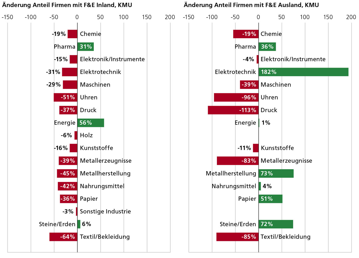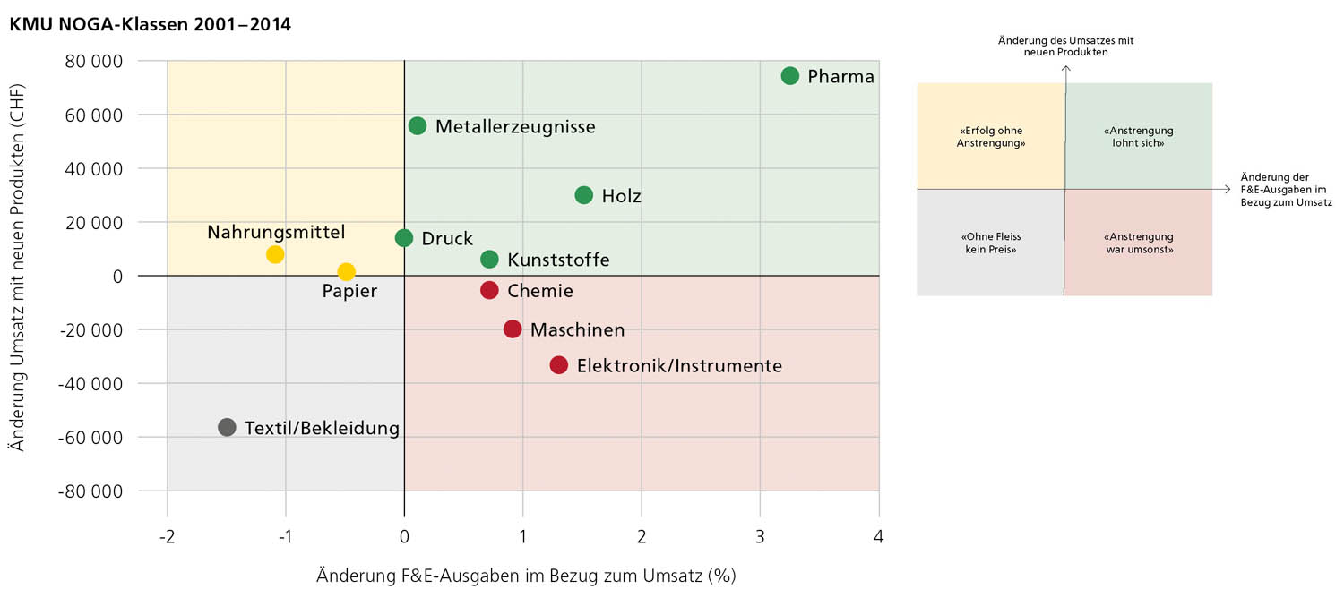 Die Studie zeigt, wie erfolgreich die F&E-Anstrengungen von Schweizer Industrieunternehmen in Bezug auf neue Produkte sind. Die Resultate für den beo-bachteten Zeitraum (2001–2014) werden in einer Portfolio-Darstellung präsentiert (siehe Grafik 2). Auf der x-Achse wird die Änderung des Umsatzanteils der F&E-Ausgaben aufgeführt, auf der y-Achse die Änderung des Umsatzes mit neuen Produkten. Während sich die F&E-Anstrengungen bei den KMU in einigen Klassen wie Pharma, Holz oder Metallerzeugnisse gelohnt haben, sah es in den Klassen Elektronik/Instrumente, Maschinen oder Chemie weniger gut aus. Dort sanken die Umsätze der KMU mit neuen Produkten, trotz prozentual höheren F&E-Ausgaben. Beunruhigend ist der Befund für KMU der Klasse Textil/ Be-kleidung: Sie haben die F&E-Ausgaben prozentual reduziert und ihre Umsätze mit neuen Produkten sind gesunken. Veränderte Rahmenbedingungen, stärkere Konkurrenz oder wegbrechende Märkte sind mögliche Ursachen.