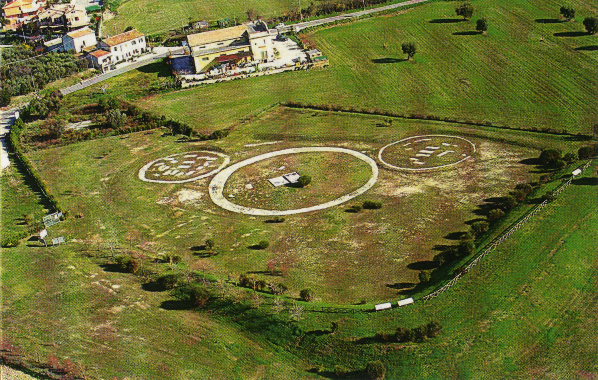 Luftaufnahme des Areals „I Pini“ von Sirolo (Prov. Ancona), mit dem großen Kreisgraben der „Tomba della Regina“ zwischen zwei anderen Kreisgräben. Foto: Soprintendenza Archeologia, Belle Arti e Paesaggio der Region Marche.
