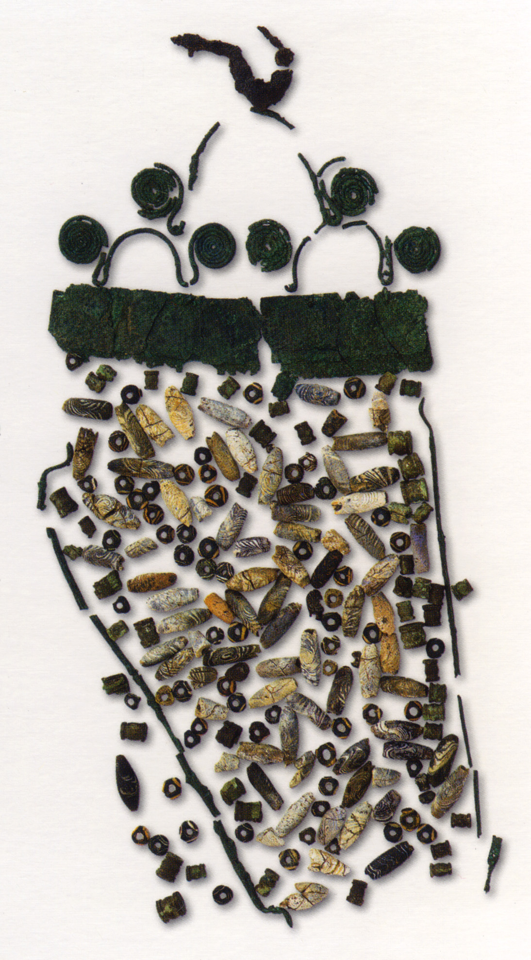 Eiserne Fibel mit Anhänger aus Bronze und Glas- sowie Beinperlen. Aus der Grube 1 der „Tomba della Regina“. Foto: Soprintendenza Archeologia, Belle Arti e Paesaggio der Region Marche.
