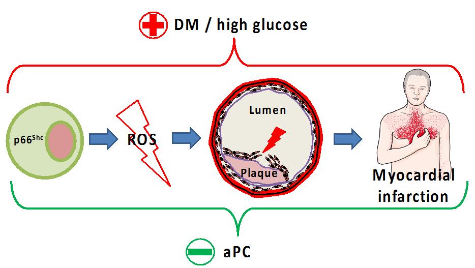 Diabetes mellitus (DM) and the associated hyperglycaemia cause an increase of the redox-protein p66Shc and reactive oxygen species (ROS) in macrophages, causing instable plaques, which predisposes diabetic patients to myocardial infarction. These effects are counteracted by the cytoprotective effects of the coagulation protease activated protein C (aPC). Human torso reflecting myocardial infarction symptoms is taken from https://smart.servier.com.
