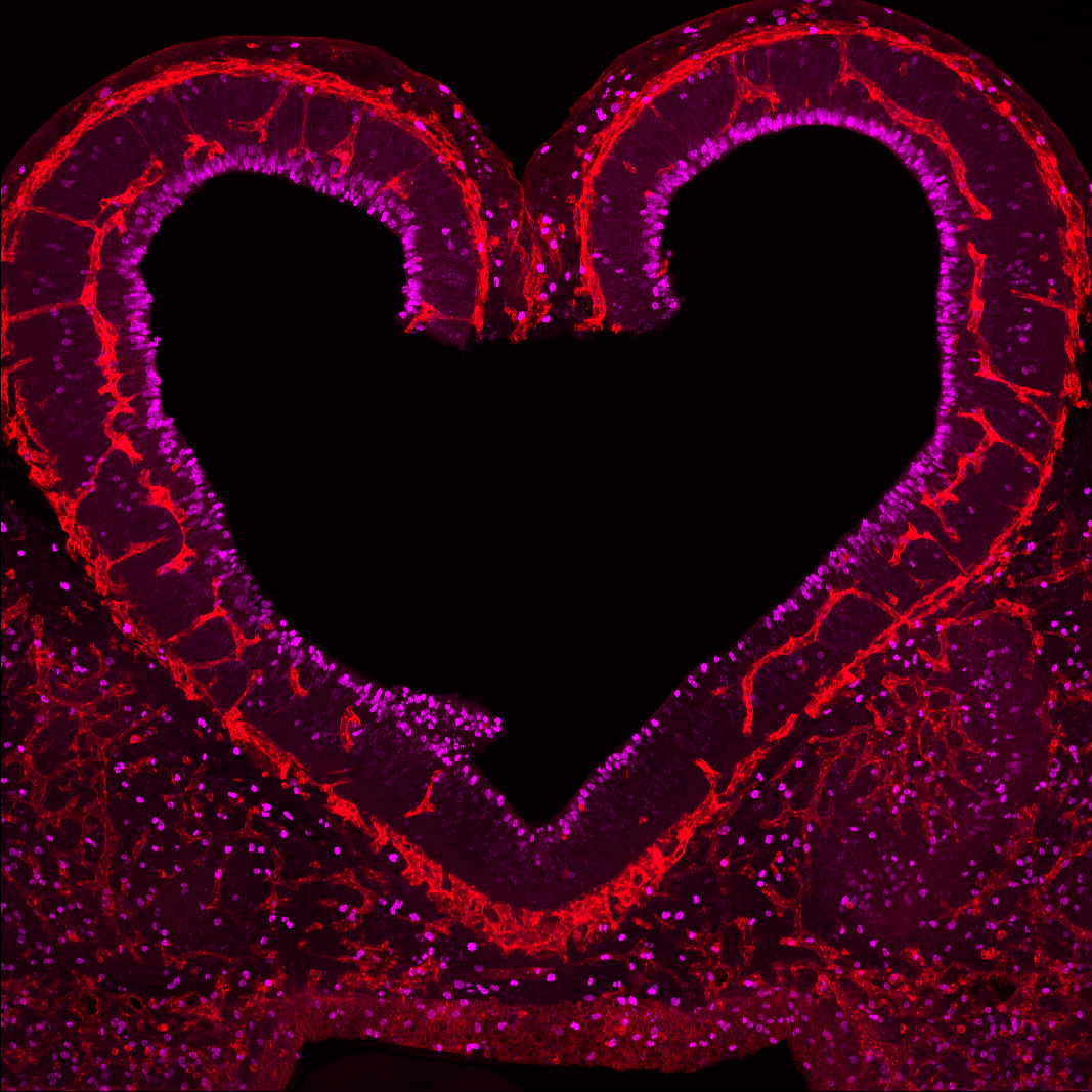 Bildunterschrift: Blutgefaesse (in Rot) in enger Kommunikation mit sich vermehrenden Nervenzellen in der Maeuse-Grosshirnrinde eines zehn Tage alten Embryos. (Photo: Cecilia Llao-Cid).