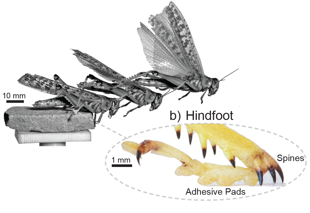 Woodward beobachtete, dass die Stacheln am Fuß der Heuschrecke gut mit rauen Oberflächen interagieren. Ihre scharfe, spitze, nadelartige Struktur verhindert das Wegrutschen der Heuschrecke, indem sie sich in die raue Oberfläche hineinkrallt. „Wir haben entdeckt, dass die Stacheln bei rauen Oberflächen nützlich sind und die Ballen bei glatten Oberflächen wie Fensterglas. Auch haben wir beim Bau des Roboters festgestellt, dass wenn wir einige der Eigenschaften ändern – was wir mit der Heuschrecke natürlich nicht machen können – die beiden Befestigungsmechanismen Ballen und Stacheln sich gegenseitig aushelfen". Woodward nahm an seinem Roboter z. B. die Ballen an den Füßen ab und erhöhte die Sprungkraft. Auf der von ihm verwendeten Sandsteinoberfläche beobachtete er große Kratzer auf dem Stein, wo die Stacheln durch das Material rissen. „Wenn man die Pads hinzufügt, addiert man tatsächlich genügend Reibung, um die Kraft auf die Stacheln auf ein Niveau zu senken, auf dem sie sich an der schwachen Sandsteinoberfläche festhalten können. So sind nicht nur die Ballen und die Stacheln für verschiedene Oberflächen ausgelegt, sie helfen sich auch gegenseitig."