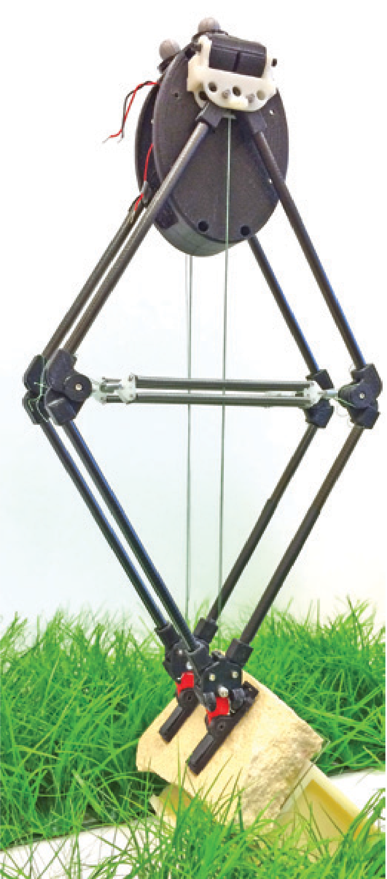 Woodward, der sowohl Maschinenbauingenieur, Robotiker als auch Biologe ist, untersuchte die Fußstruktur der Wüstenheuschrecke und ihr Sprungverhalten auf verschiedenen Oberflächen, um die Eigenschaften zu extrahieren, die dazu beitragen, dass das Tier – wenn es ins Rutschen kommt – schnell Halt findet (indem es die Reibung erhöht). Er ließ die Heuschrecke zum Beispiel von wasserabweisendem Glas, von Gitter, Holz oder Sandstein springen (wie in dem Youtube-Video zur Forschungsarbeit zu sehen ist, Link siehe unten). Um zu verstehen, wie das Insekt sowohl von einer glatten als auch von einer rauen Oberfläche springen kann, baute der Wissenschaftler einen von der Heuschrecke inspirierten Roboter (siehe Abbildung 1). Er dient dazu, das Sprungverhalten der Heuschrecke zu imitieren. Woodward baute viel Heuschrecken-inspiration ein, veränderte aber auch den natürlichen Bauplan: Um die Bewegung der Beine auf das zum Springen Wesentliche zu beschränken, spiegelte Woodward die Segmente des Heuschreckenbeins und baute diese Doppelung ein.