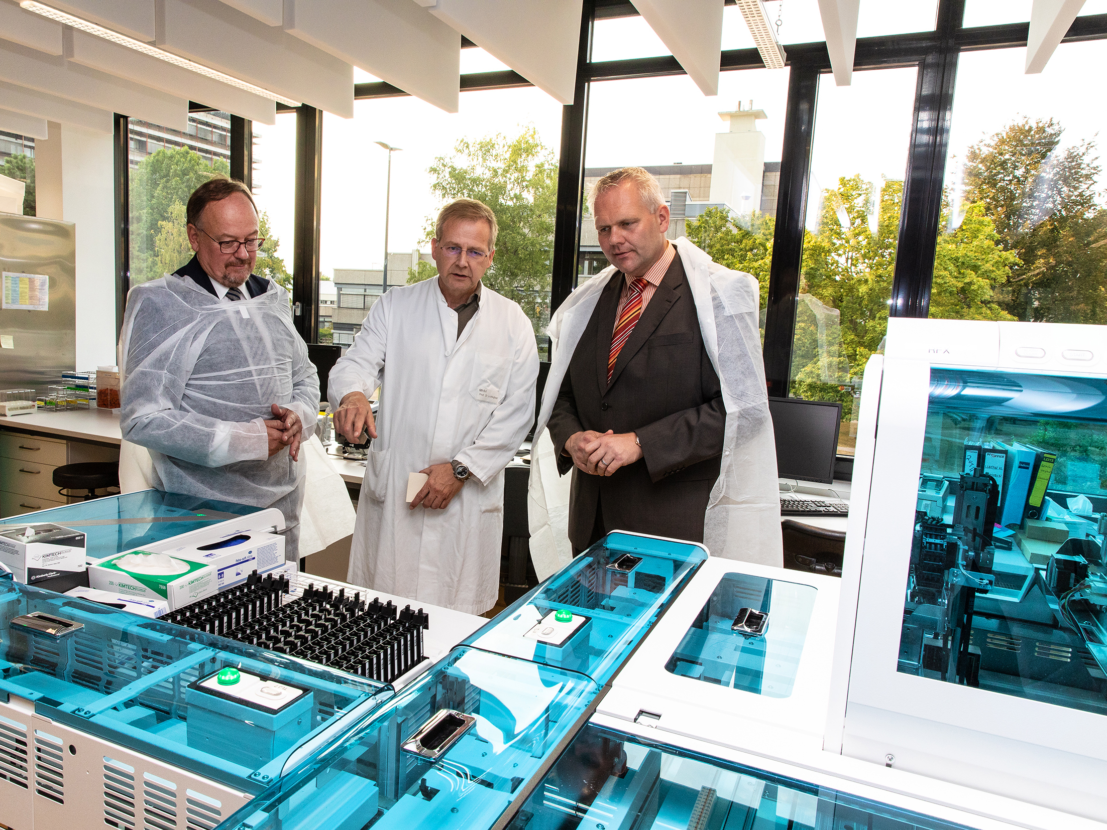 Professor Dr. Korbinian Brand, Direktor des Instituts für Klinische Chemie und Leiter des Zentrallabors, erläuterte in seiner Rede zur Eröffnung die Vorzüge des neuen Zentrallabors: „Im Zentrallabor finden wir eine Zentralisierung und Konsolidierung der Labordiagnostik. Modernste Technologie wird auf der Laborstraße und in den Speziallabors angewendet. Die Laborstraße ist größtenteils automatisiert und wird 24 Stunden an sieben Tage die Woche betrieben.“ Die Beteiligung von marktführenden Firmen erlaube die Realisierung eines führenden Konzepts in EU. „Wir erreichen eine Optimierung der analytisch-diagnostischen Abläufe und eine Optimierung der betriebswirtschaftlichen Situation“, betonte Professor Brand. „Die unmittelbare Nähe auf dem Unicampus erlaubt ein hohes Tempo bei der Durchführung, eine enge interdisziplinäre Zusammenarbeit und eine direkte Rücksprache bei Problemen.“ Das Zentrallabor repräsentiere außerdem eine direkte Schnittstelle zu Forschung und Lehre“, sagte er. „Das Zentrallabor der MHH ist ein Vorbild, wie eine moderne diagnostische Patientenversorgung in einem Universitätsklinikum durchgeführt werden sollte.“