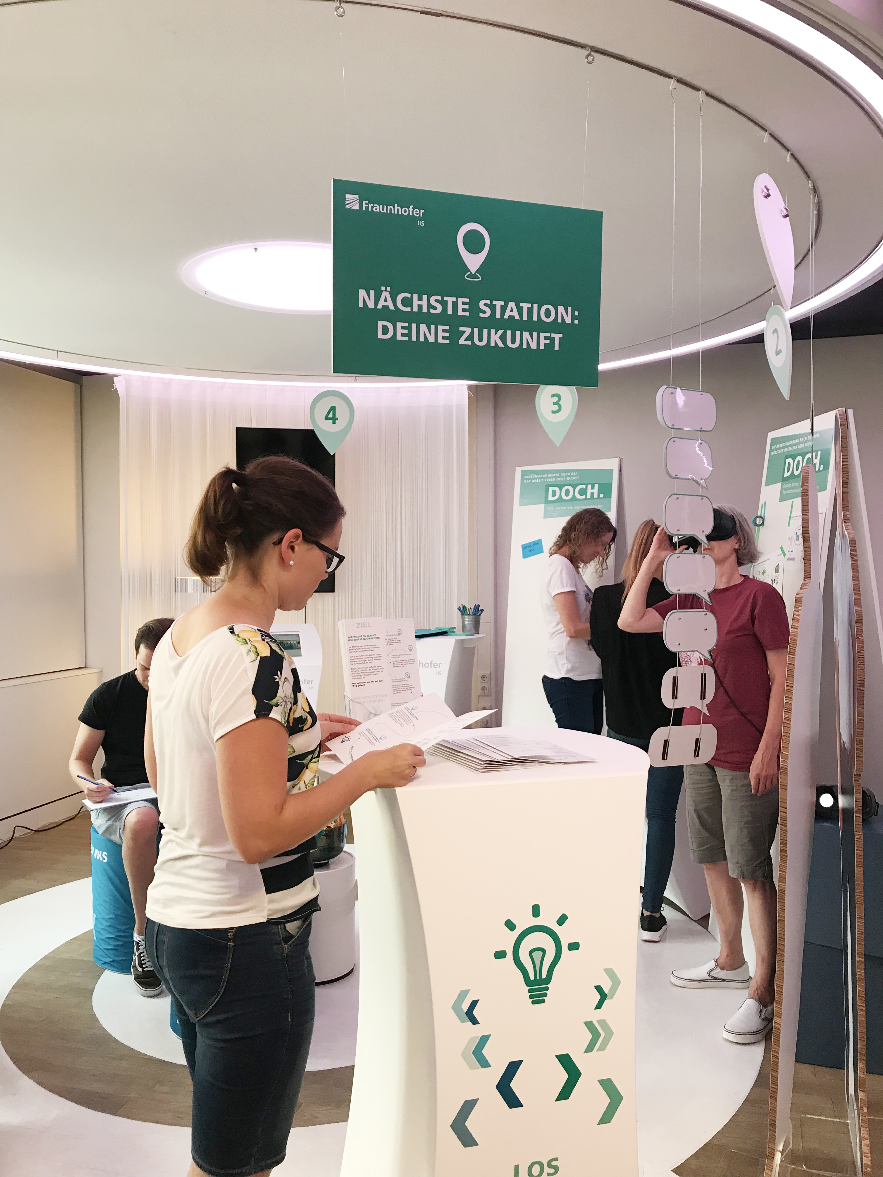 Besucher können auf der Forschungsinsel mitteilen, welche Werte ihnen bei der Arbeit wichtig sind. Diese können sie mit den Werten des Fraunhofer IIS und von zwei Forschern des Instituts, die exemplarisch über ihre Erfahrungen am Arbeitsplatz berichteten, abgleichen. An einer Jobwall können Besucher die aktuellen Stellenausschreibungen am Fraunhofer IIS sehen und nach passenden Stellen suchen.