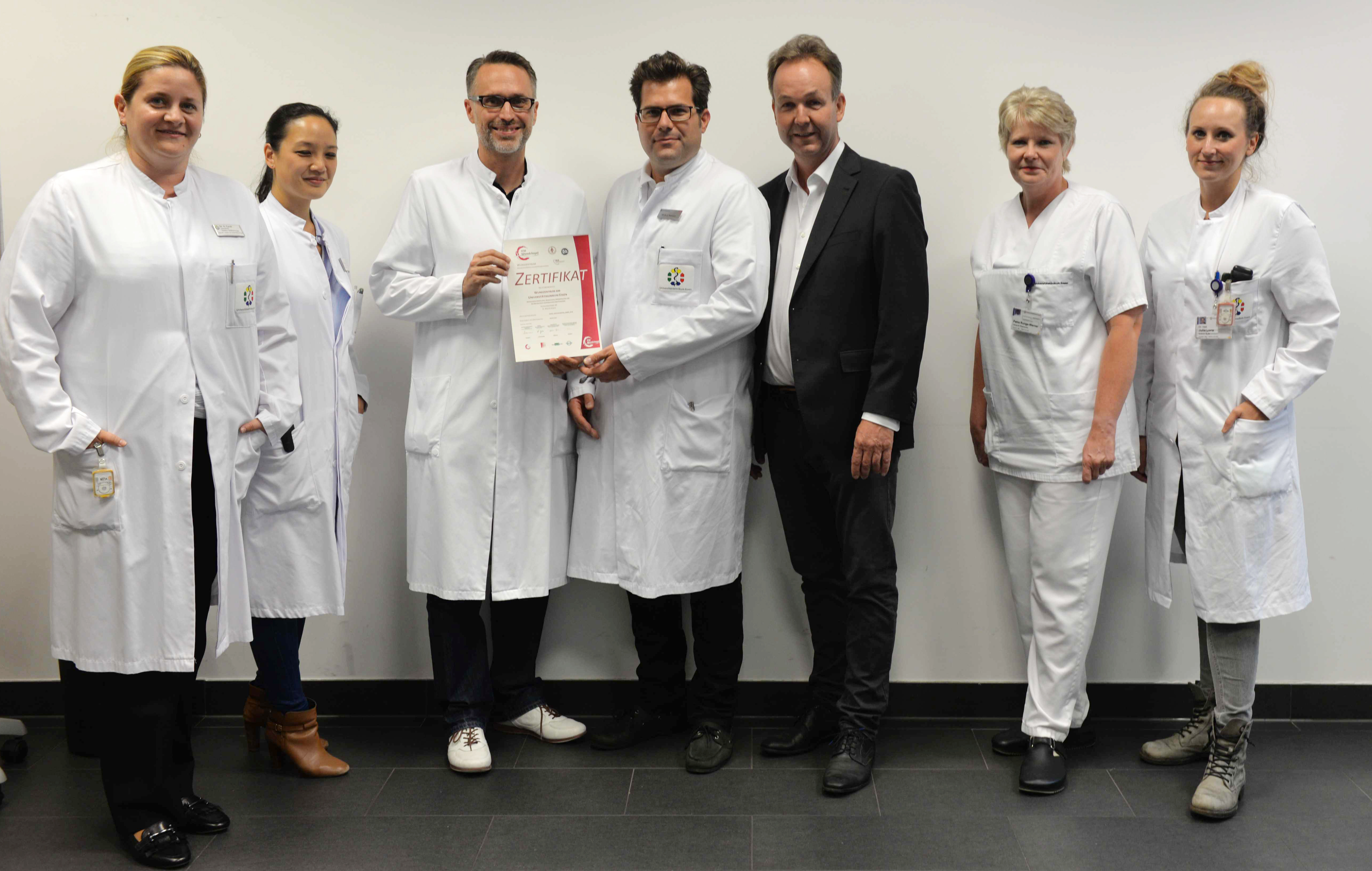 Essen, 31.8.2018 – Als erstes Wundzentrum in Deutschland, zu dem neben den Fachbereichen Dermatologie und Gefäßchirurgie jetzt auch die Angiologie zählt, wurde das Wundzentrum am Universitätsklinikum Essen jetzt zertifiziert. Die drei Disziplinen erfüllen alle Wundsiegelkriterien der jeweiligen Fachgesellschaften. Offiziell übergab jetzt das Wundsiegelzertifikat Prof. Knut Kröger, Vorstandsmitglied der „Initiative Chronische Wunden“ (ICW e. V.), an das Team.