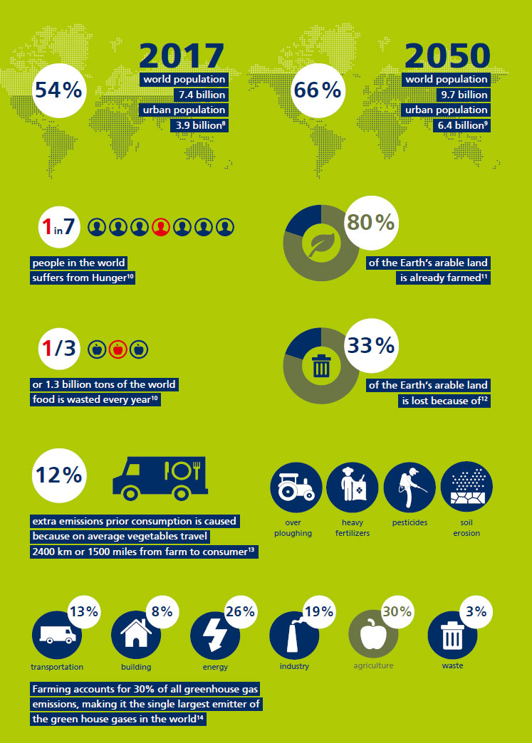 Die städtische Landwirtschaft wird zunehmend in stark urbanisierten Ländern mit begrenzten umliegenden landwirtschaftlichen Flächen wie Japan und Singapur stattfinden sowie in Ländern mit starker Luftverschmutzung und hoher Bodenverarmung. Bis 2050 werden mehr als 66 Prozent der Weltbevölkerung, dann mehr als 6 Milliarden Menschen, in Städten leben – die Möglichkeiten, alle Menschen zu ernähren, sind dann noch stärker einschränkt. Mehr Ressourcen und Investitionen in die urbane Landwirtschaft und Nahrungsmittelproduktion, die Entwicklung und Erprobung alternativer Finanzierungsstrategien sowie interdisziplinäre Ausbildung, Forschung und Entwicklung in diesem Bereich sind nötig, um diese Herausforderung anzugehen.