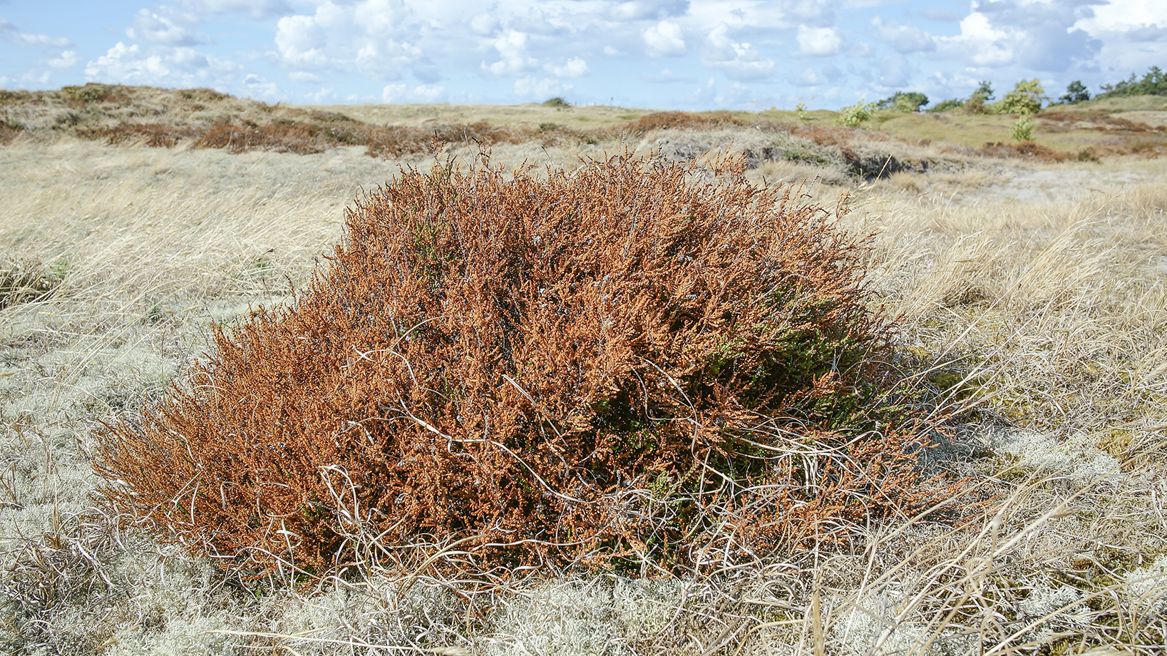 Mindestens ebenso enttäuscht dürfte der seltene Regenbrachvogel sein, eine arktische Watvogelart, die auf dem Durchzug in Scharen in der Hiddenseer Dünenheide rastet und sich von den schwarzen Früchten der Krähenbeere ernährt. Ebenso wie die Besenheide ist auch die Krähenbeere stark durch die Trockenheit beeinträchtigt, viele Sträucher sind (fast) abgestorben und tragen keine Früchte.