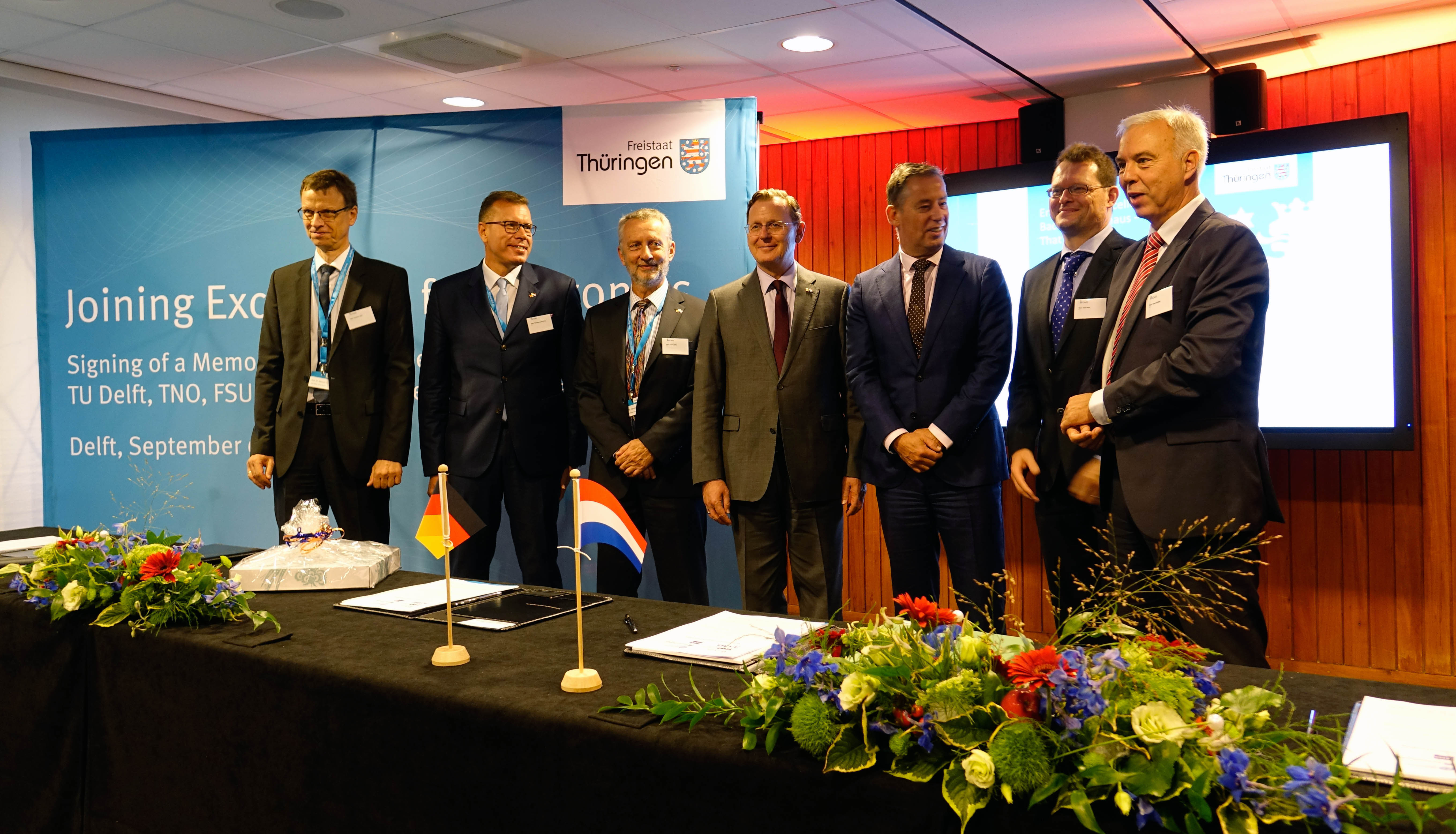 Was während des Besuchs des niederländischen Königspaares vor gut einem Jahr in Jena vereinbart wurde, nimmt Gestalt an: Die Abbe School of Photonics der Friedrich-Schiller-Universität Jena (FSU) und die Technische Universität Delft richten ein gemeinsames Ausbildungsprogramm für exzellente Nachwuchsforscherinnen und -forscher ein. Vertreter der Forschungseinrichtungen haben heute (06.09.18) an der TU Delft ein Memorandum unterzeichnet, das die vor einem Jahr vereinbarte Kooperation konkretisiert. Die Unterzeichnung fand im Beisein des Thüringer Ministerpräsidenten Bodo Ramelow statt, der vom 5. bis 7. September zum Gegenbesuch in den Niederlanden weilt. Zu den Mitunterzeichnern gehören auch das Fraunhofer Institut für Angewandte Optik und Feinmechanik (IOF), die niederländische Organisation für Angewandte Naturwissenschaften (TNO) sowie zwei Industriepartner: die Carl Zeiss AG sowie die niederländische ASML BV.