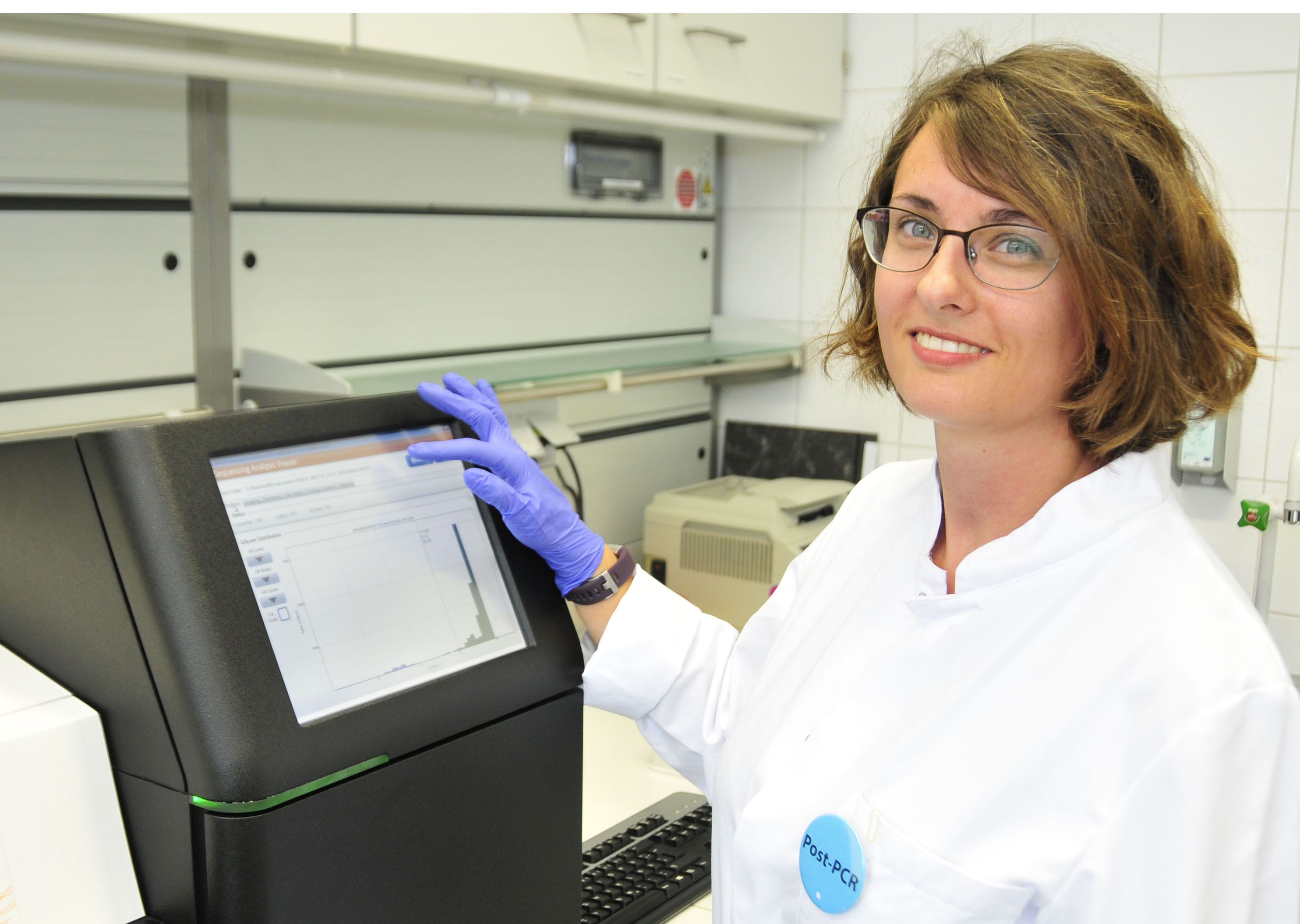 Christiane Dörte Much aus dem Institut für Humangenetik an einem Hochdurchsatzsequenziergerät.