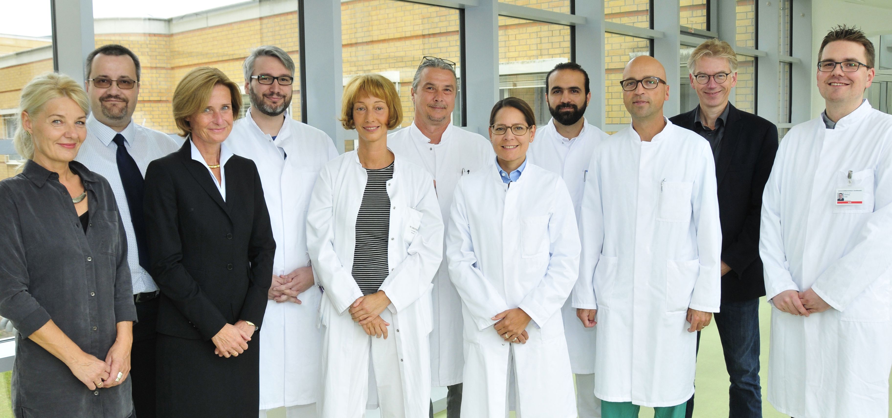 Das Interdisziplinäre Team an der Unimedizin Greifswald zur Integrierten Versorgung von Hochrisikofamilien: Schwester Martina (Hotline, v.li.), Oberarzt Dr. Eberhard Gilberg (Humangenetik), Prof. Dr. Ute Felbor (Zentrumssprecherin), Oberarzt Dr. Patrick Thamm (Radiologie), Oberärztin Dr. Antje Kristina Belau, Prof. Dr. Ralf Ohlinger, PD Dr. Dominique Könsgen-Mustea, Dr. Zaher Alwafai, Prof. Dr. Alexander Mustea (alle Frauenheilkunde), Prof. Dr. Hans J. Grabe (Psychoonkologie), Dr. Matthias Rath (Humangenetik).