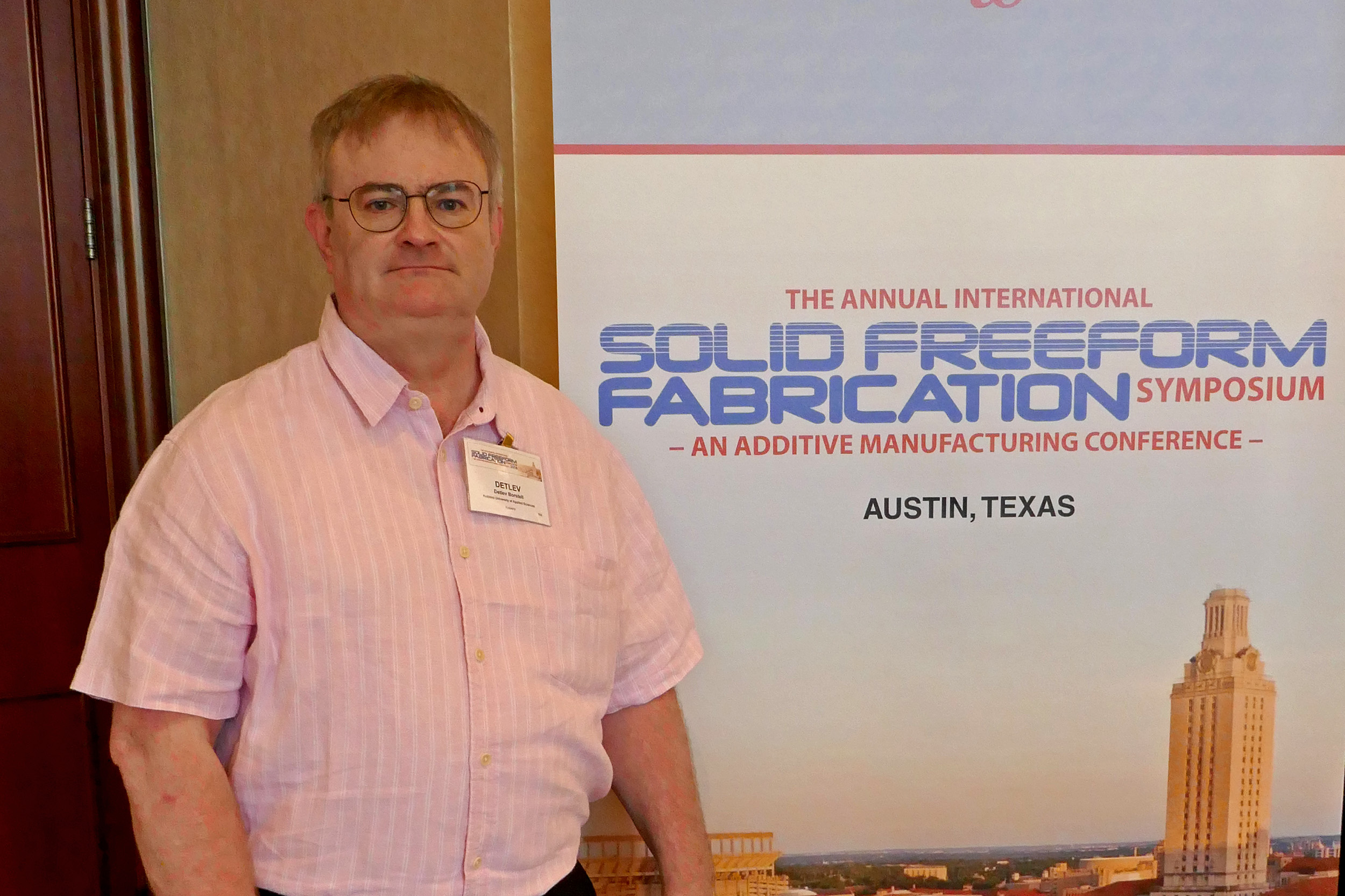KOBLENZ./AUSTIN-TEXAS. Bei der weltweit größten 3D-Druck-Tagung „Solid Freedom Symposium“ in Austin/Texas vertrat Maschinenbauprofessor Dr. Detlev Borstell vom Fachbereich Ingenieurwesen die Hochschule Koblenz. Mit seinem Vortrag zum Thema "Knowledge-Based Material Production in the Additive Manufacturing Lifecycle of Fused Deposition Modeling” in Zusammenarbeit mit dem DiK (Fachgebiet Datenverarbeitung in der Konstruktion) der Technischen Universität Darmstadt nahm er als Referent unter rund 650 Teilnehmenden aus 18 Ländern teil.