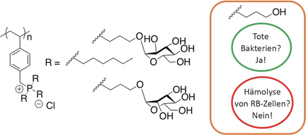 Der Bedrohung durch mehrfach resistente pathogene Keime versuchen Wissenschaftler zunehmend mit der Entwicklung von Designerpolymeren zu entgegnen. Solche Polymere spiegeln die Wirkungsweise der leistungsfähigen Peptid-Antibiotika wider. Paul J. Ragogna und Beth Gillies an der Western University in London (Kanada) untersuchen zu diesem Zweck phosphorhaltige Polymersalze. Diese Polyphosphonium-Verbindungen vereinen in ihrer molekularen Struktur ein Kohlenwasserstoff-Rückgrat und positiv geladene Phosphorzentren in jeder Wiederholungseinheit. Wahrscheinlich ermöglicht die besondere Kombination aus wasserabweisenden Kohlenwasserstoffketten am Phosphor und positiver Ladung, dass diese Polymere gezielt an Bakterienzellen andocken und diese dann auflösen können.