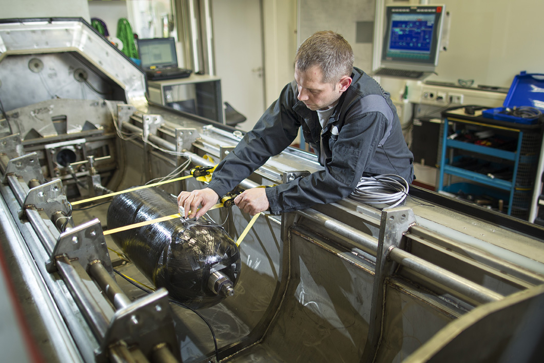 Überstehen die neuen Druckbehälter die Impactbelastungen, werden sie noch auf ihre Rest-Berstfestigkeit getestet. Dann zeigt sich, ob die Speicher sicher betrieben werden können und ihre Widerstandsfähigkeit durch die angestrebte Materialeinsparung nicht schlechter oder sogar besser geworden ist.