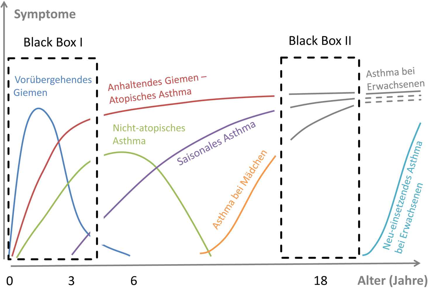 Was ist Asthma – und wenn ja wie viele? Frei nach einem populären Buchtitel könnte man auch die Fragestellung der All Age Asthma Cohort (ALLIANCE) definieren. Denn tatsächlich kennen Mediziner nicht nur ein Asthma, sondern eine Vielzahl typischer Krankheitsverläufe (siehe Abbildung). Bei gut einem Viertel aller Kinder tritt mindestens einmal in der frühen Kindheit Giemen auf. Dabei handelt es sich um ein typisches Geräusch beim Ausatmen, das durch verengte Atemwege hervorgerufen wird. Gleichwohl es Anzeichen für ein späteres Asthma sein kann, behalten nur 3-5% aller Kinder, die Giemen oder andere frühe Symptome zeigen, ihr Asthma bis zum Erwachsenenalter. In anderen Fällen tritt Asthma überhaupt erst im Erwachsenenalter auf, dann aber oft in schwerer Form.