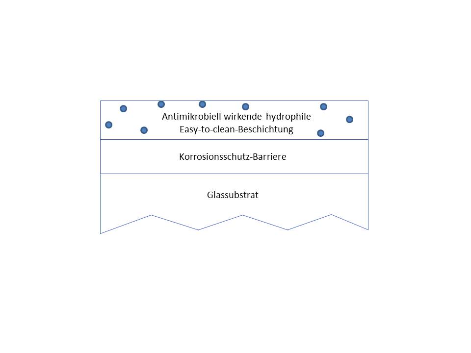 Der Kontakt von Glas mit Feuchtigkeit und Hitze lässt sich im Sanitärbereich kaum vermeiden. Allerdings kann diese Beanspruchung zu Glaskorrosion führen, welche als irreversible Trübung der Glasoberfläche wahrgenommen wird. Auf großen Flächen, wie z.B. Duschkabinen aus Glas, ist diese Veränderung besonders deutlich erkennbar. Zudem entstehen bei der Benutzung weitere Verschmutzungen durch Seifenreste und Kalkablagerungen. Die zur Reinigung verwendeten Mittel können das Glas wiederum schädigen. Ein weiteres Problem, insbesondere im Gesundheitswesen, stellt zudem das hohe Infektionsrisiko an kontaminierten Oberflächen dar. Gerade in Krankenhausumgebungen ist dies mittlerweile eine ernst zu nehmende Problematik. Der momentane Stand der Technik lässt es zu, mithilfe entsprechender Beschichtungen Anhaftungen zu verringern und Glaskorrosion zu vermeiden. Eine zusätzliche Keimreduzierung, beispielsweise durch eine antimikrobielle Ausstattung der Oberflächen, würde einen wesentlichen Beitrag zur Senkung des Infektionsrisikos leisten.