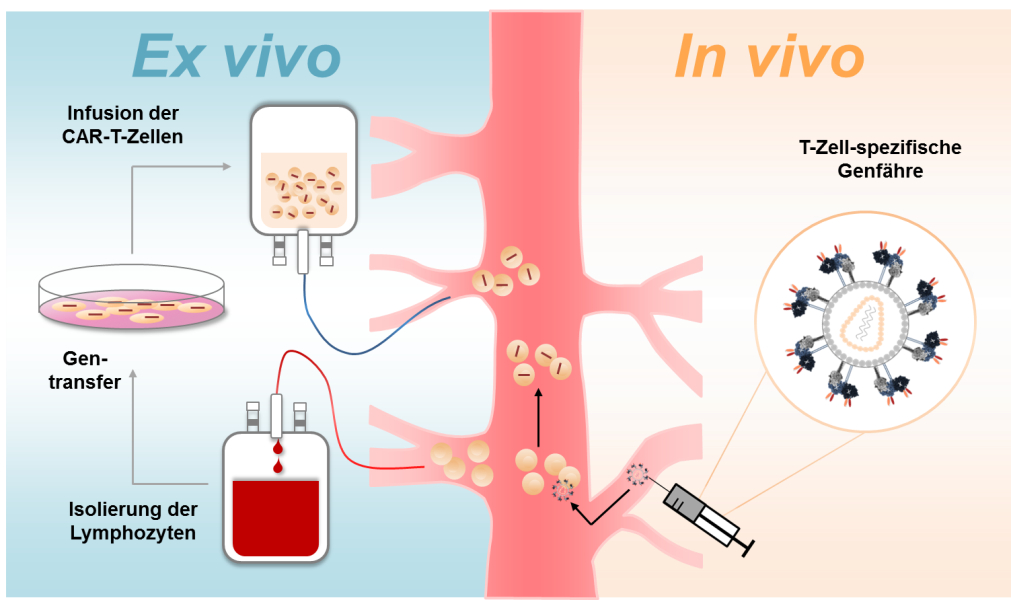 Forschern des Paul-Ehrlich-Instituts um Prof. Christian Buchholz, Leiter der Forschungsgruppe "Molekulare Biotechnologie und Gentherapie" des Paul-Ehrlich-Instituts, ist es im Rahmen eines von der Deutschen Krebshilfe geförderten Forschungsprojekts zusammen mit Kollaborationspartnern gelungen, diese genetische Modifikation humaner T-Zellen in vivo – also direkt im Organismus – vorzunehmen. Entscheidend für diesen Erfolg waren speziell modifizierte lentivirale Vektorpartikel (Genfähren), die das CAR-Gen ausschließlich in die für die Tumorabwehr zuständigen T-Zell-Subtypen übertrugen. Für ihren Nachweis nutzten die Forscher Mäuse, die vorher menschliche Blutzellen erhalten hatten. Eine intravenöse Injektion mit den Vektorpartikeln reichte aus, um so viele CAR-T-Zellen in vivo zur erzeugen, dass sie im Blut und in Lymphorganen der Tiere nachweisbar waren. Diese in vivo erzeugten CAR-T-Zellen vermehrten sich zudem wie gewünscht bei Kontakt mit dem Antigen und eliminierten CD19-positive Zellen. Wie in der klinischen Anwendung von CAR-T-Zellen beobachtet, kam es bei einigen Tieren zu einem Zytokinsturm und zu neurologischen Ausfällen.