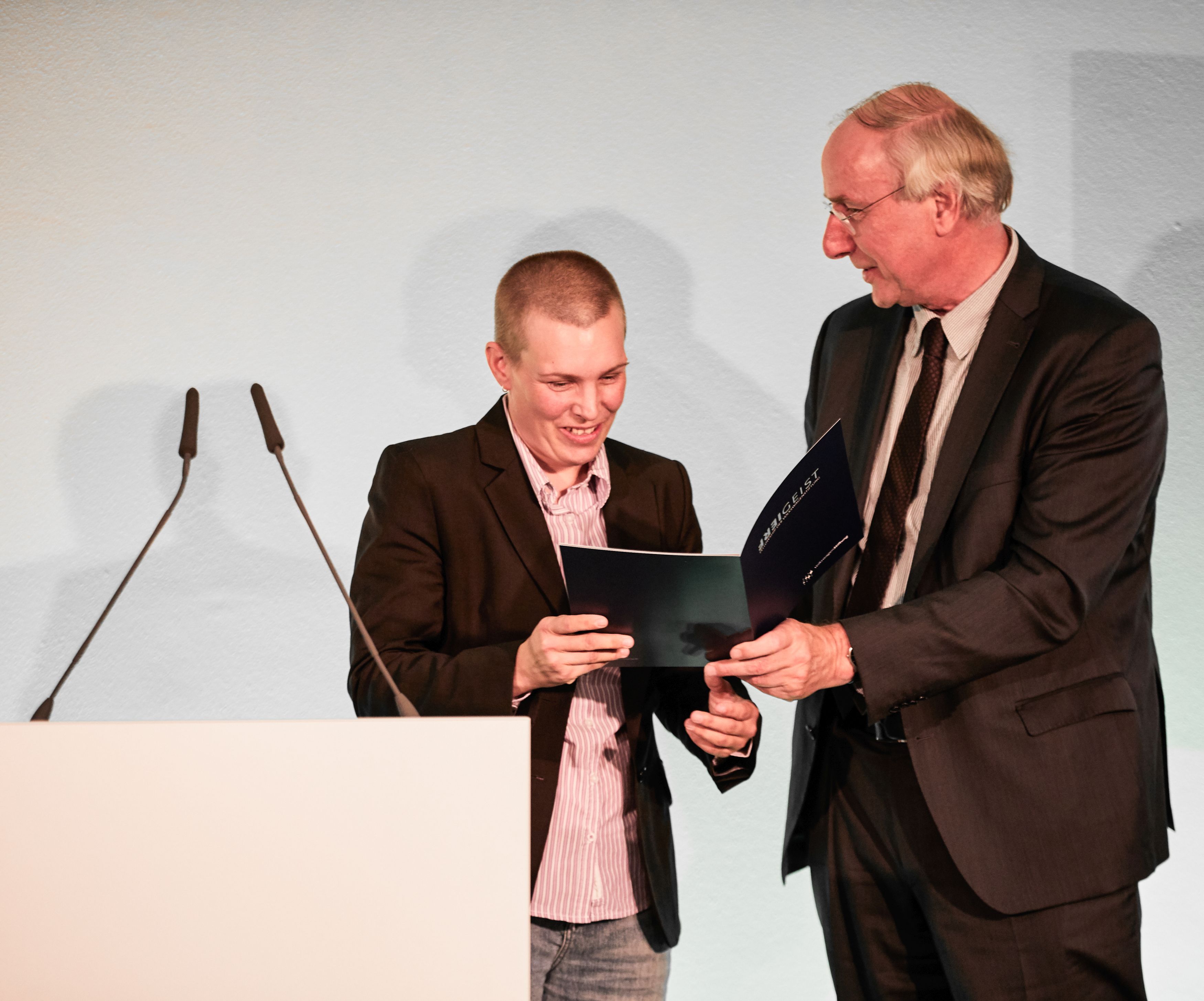 Bildunterschrift: Dr. Wilhelm Krull, Generalsekretär der VolkswagenStiftung, übergibt Dr. Frigga Kruse den Förderbescheid in Höhe von einer Million Euro.