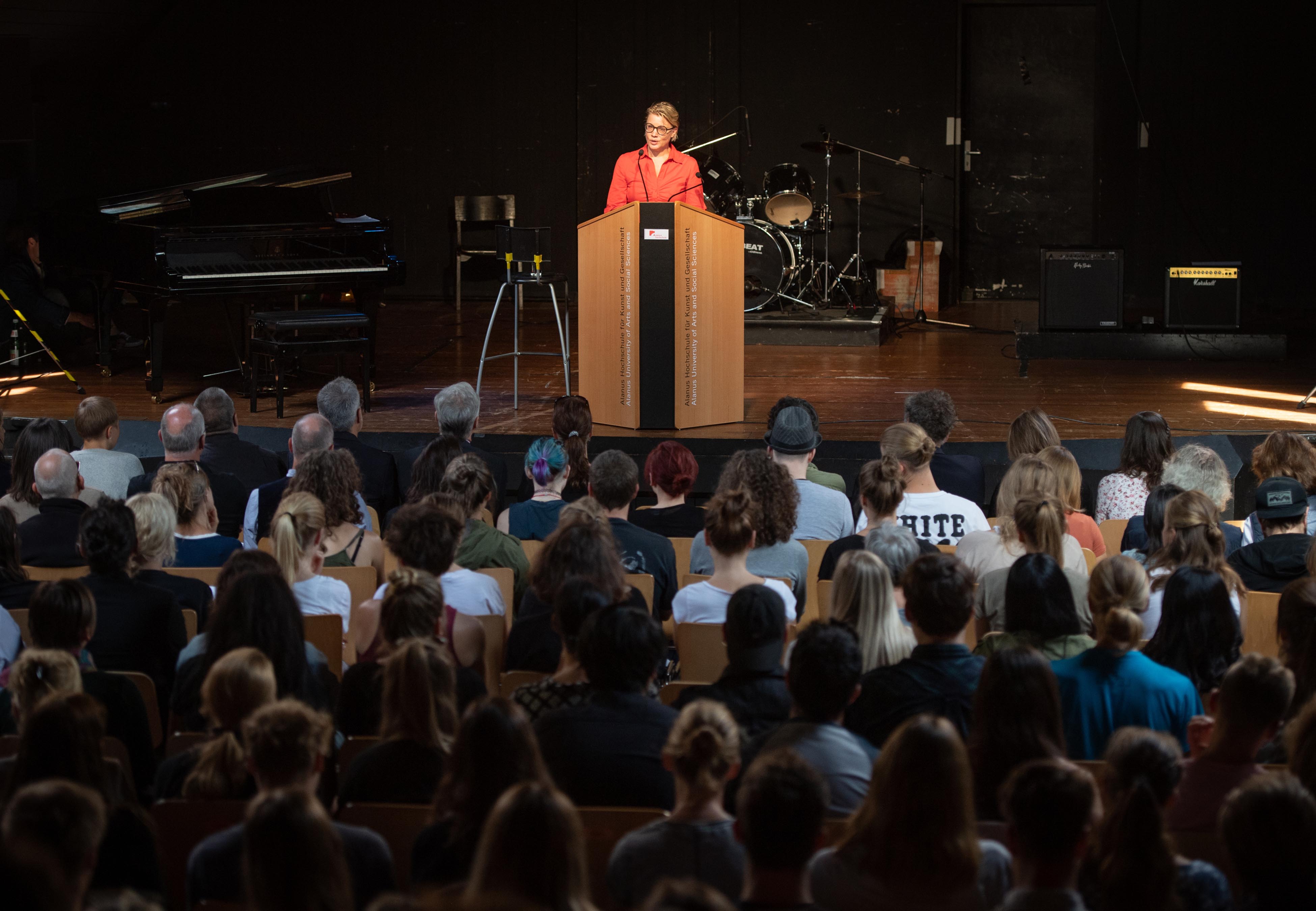 „Dies ist ein Neubeginn für uns alle“, empfing Monika Kil die Studienanfänger im Großen Saal am Campus I. Für Kil war es der erste öffentliche Auftritt in der Region, seit September hat die Erziehungswissenschaftlerin das Amt der Rektorin inne. In ihrer Rede animierte Kil die Studierenden: „Packen Sie die Gelegenheiten, die sich Ihnen genau jetzt bieten, beim Schopf. Leben Sie das Leben, das Sie gerne führen möchten“. Und forderte auf: „Bringen Sie sich in die Lehr- und Forschungskonstellationen dieser besonderen Hochschule ein und profitieren Sie davon“.