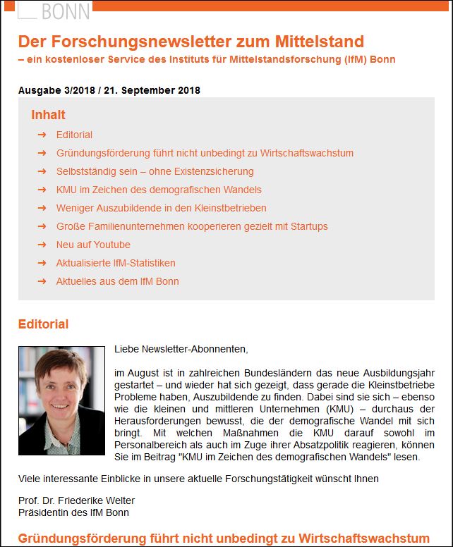 Im aktuellen Forschungs-Newsletter des IfM Bonn können Sie lesen, warum mehr Gründungen nicht per se zu mehr Wirtschaftswachstum in einer Region führen. Außerdem haben die IfM-Wissenschaftler untersucht, wie sich Neugründungen entwickeln.