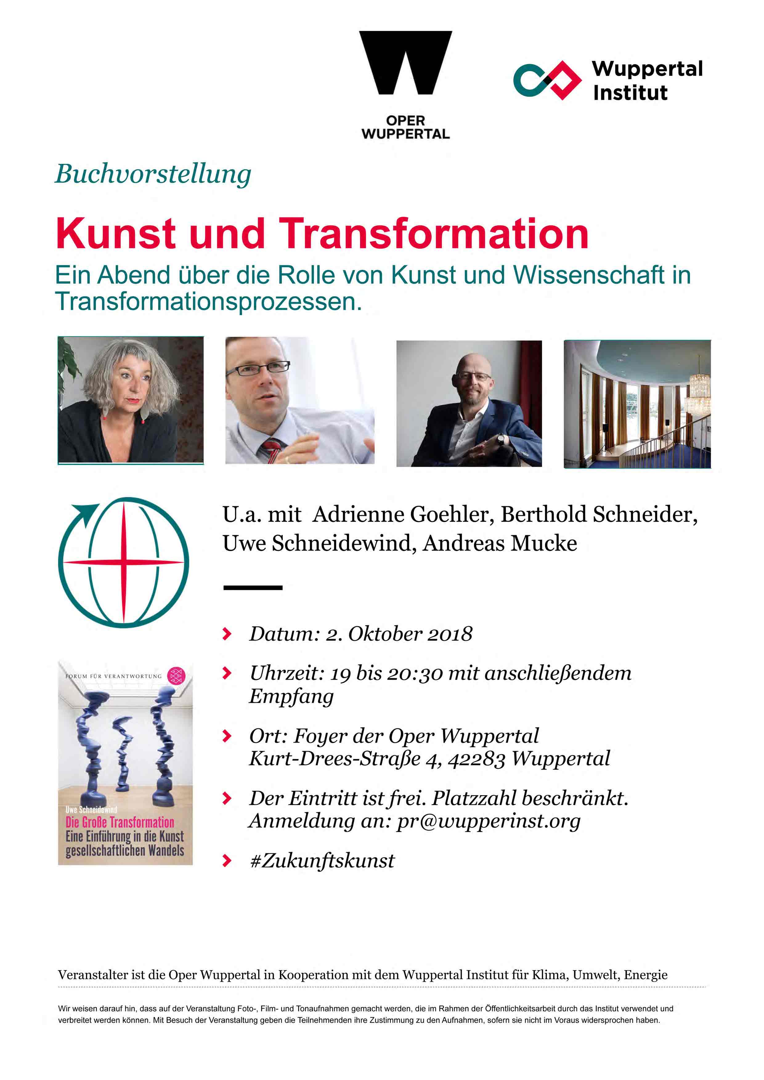 Die Veranstaltung „Kunst und Transformation – Ein Abend über die Rolle von Kunst und Wissenschaft in Transformationsprozessen“ findet im Kronleuchterfoyer der Oper Wuppertal, Kurt-Drees-Straße 4, 42283 Wuppertal am Dienstag, 2. Oktober 2018, um 19:00 Uhr (Einlass 18:30 Uhr) mit anschließendem Empfang, statt.