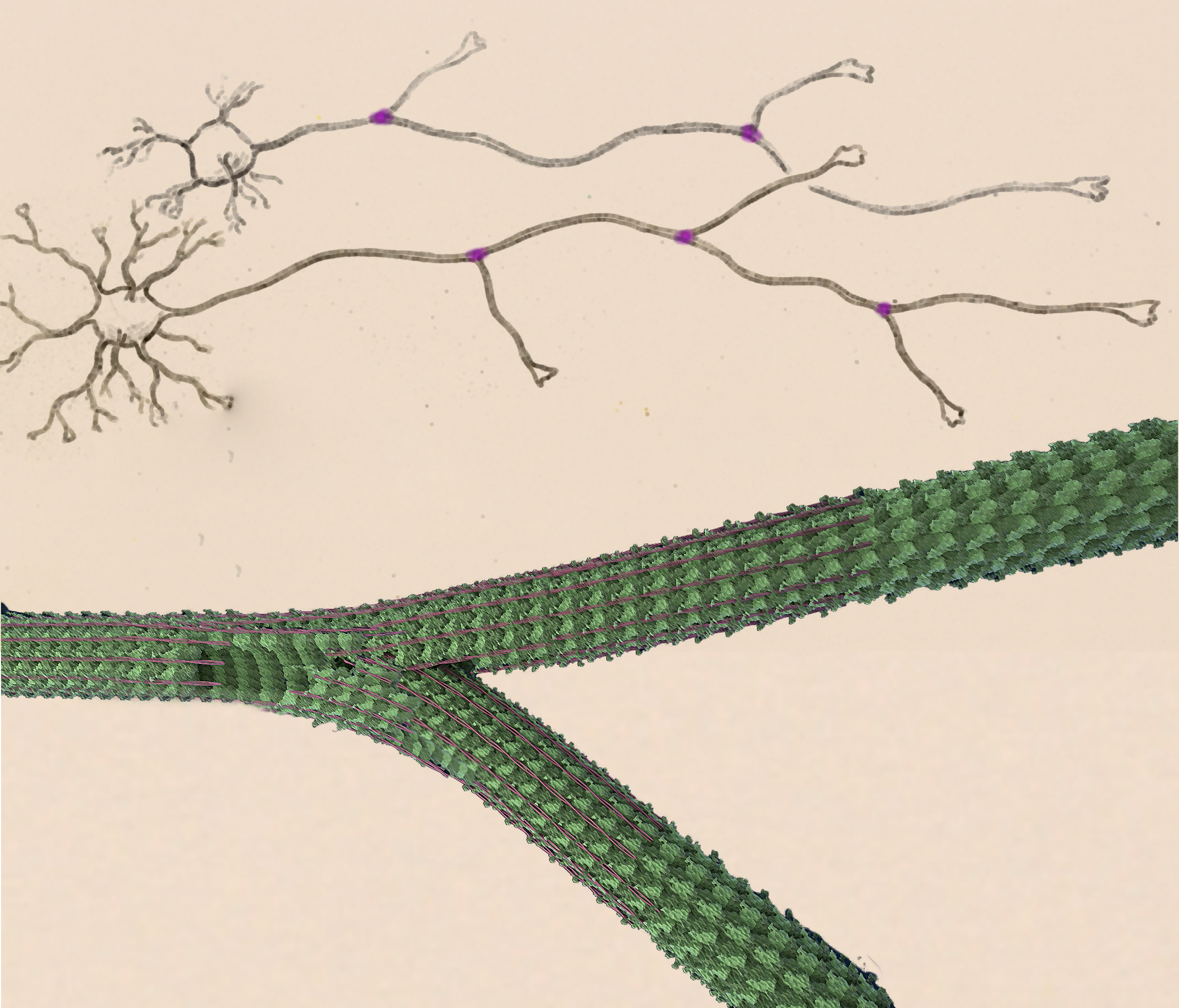 Die Form des Axons wird durch ein internes System aus Hohlröhrchen, den Mikrotubuli, stabilisiert. Mikrotubuli sind gut erforschte Bestandteile des Zellskeletts. Sie bestimmen die Zellform und sind an verschiedenen Prozessen wie Zellteilung und Stofftransport innerhalb der Zellen beteiligt. Sie kombinieren somit verschiedene Funktionen, ähnlich wie intrazelluläre Eisenbahnstrecken, deren Stahlschienen gleichzeitig die Zellstatik erhalten. Mikrotubuli bestehen aus kleinen Tubulinbausteinen. Dies sind Proteine, die sich parallel zueinander ausrichten und ein hohles Röhrchen aufbauen. Durch die hohle Struktur besitzen Mikrotubuli eine bemerkenswerte Steifigkeit. Durch Anlagerung der Tubuline an ein Ende können die Mikrotubuli in der Länge wachsen. „Forscher waren bislang nicht in der Lage, den Vorgang der Mikrotubulusverzweigung zu beobachten“, erzählt Nirakar Basnet, Doktorand in Naoko Mizunos Arbeitsgruppe und Erstautor der Studie. „Wir zeigen, dass sich ein Protein namens SSNA1 an den Stellen ansammelt, an denen Axone Verzweigungspunkte bilden. Da die Axonform ja von den Mikrotubuli abhängt, entstand unsere Vermutung, dass SSNA1 mit den Mikrotubuli interagiert“, so Basnet.