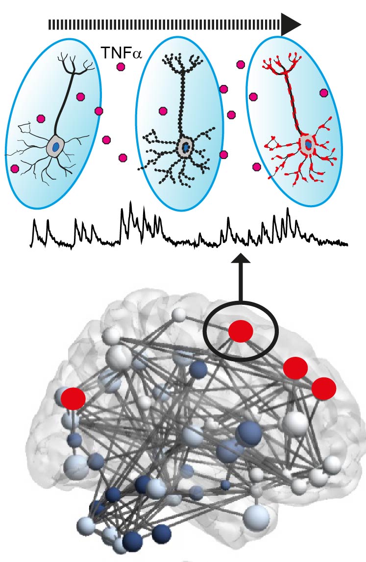 Bildunterschrift: Infolge eines entzündlichen Angriffs kommt es danach, getriggert durch TNF-α, zu erhöhter Netzwerkaktivität von Nervenzellen. Diese begünstigt im Verlauf Neurodegeneration.