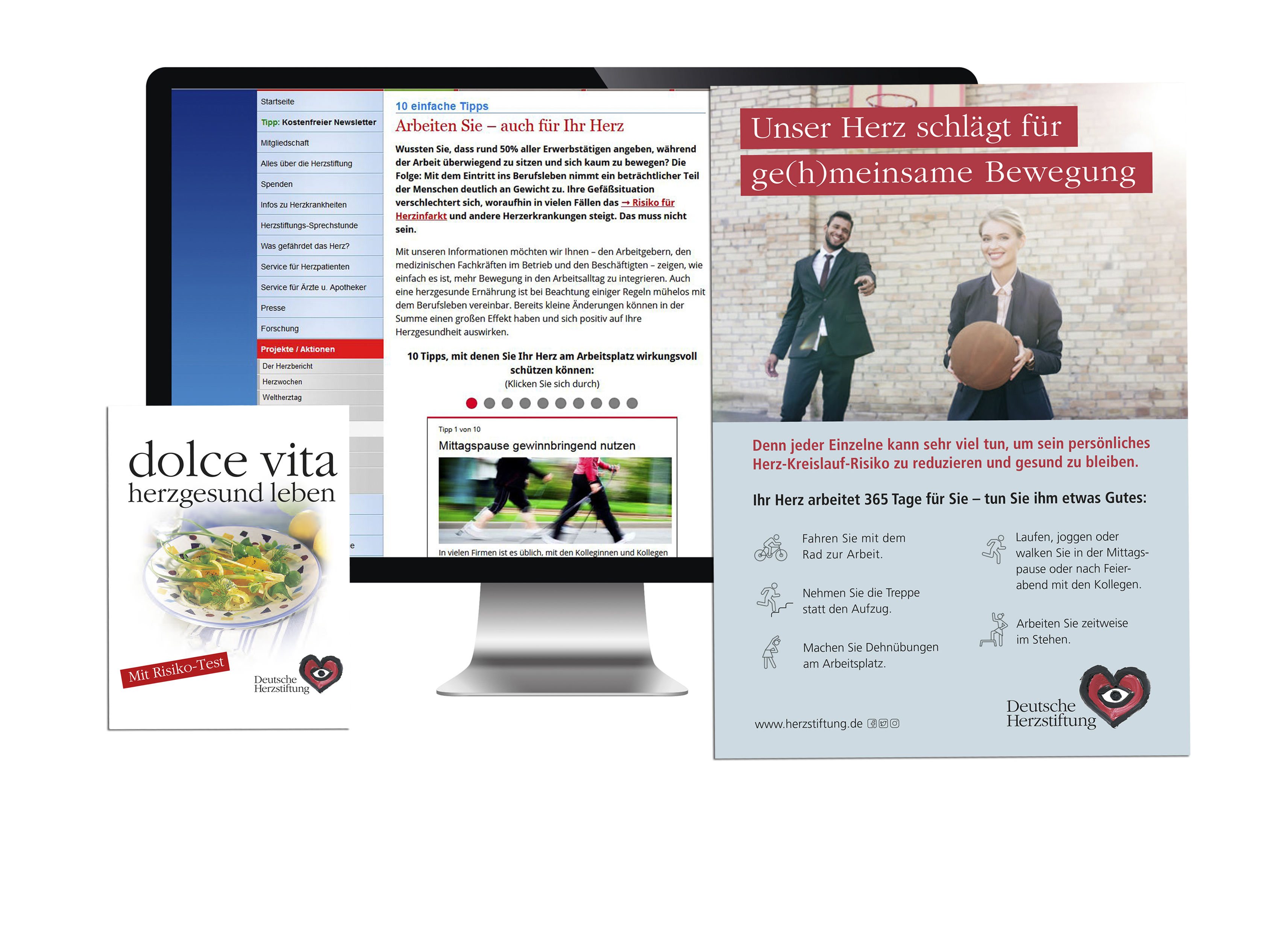 Mit dem neuem Informationsmaterial, das neben den Bewegungstipps auch für weitere Themen wie Rauchstopp, Stressabbau, herzgesunde Ernährung und Wiederbelebung ausgearbeitet wird, können sich Berufstätige – am besten in Teams – gegenseitig Aufgaben zu diesen Präventionsthemen stellen. „Das fördert ihre körperliche Fitness und stärkt den Teamgeist“, betont Voigtländer. Dabei sind die Aufgaben so konzipiert, dass sie in Zusammenarbeit leichter zu bewältigen sind. „Wir alle haben unser Risiko für Herzinfarkt und Schlaganfall zu einem Großteil selbst in der Hand“, unterstreicht der Ärztliche Direktor am Cardioangiologischen Centrum Bethanien (CCB) des Agaplesion Krankenhauses in Frankfurt am Main. Denn Schätzungen zufolge sind 80 Prozent der vorzeitigen Todesfälle aufgrund von Herz-Kreislauf-Erkrankungen im Alter von 30 bis 70 Jahren vermeidbar, wenn die Risikofaktoren wirksam kontrolliert werden und ein gesunder Lebensstil geführt wird. „Dazu zählt insbesondere ausdauerorientierte Bewegung: am besten fünfmal pro Woche je 30 Minuten gemäß der WHO-Empfehlung. Aber mit intensiver körperlicher Aktivität dreimal pro Woche je 30 Minuten ist auch schon viel erreicht“, betont Voigtländer. Bewegung hilft, Stress auszugleichen und wer sportlich aktiv ist, beschäftigt sich auch eher mit seiner Ernährung. Nicht beeinflussbare Faktoren sind unser Alter, das Geschlecht und die genetische Vorbelastung. Generell sollte jeder im Alter ab 35 Jahre regelmäßig zur Vorsorge-Untersuchung, um frühzeitig Herzinfarkt-Risikokrankheiten wie Bluthochdruck, Fettstoffwechselstörungen, Diabetes und Übergewicht aufzudecken.