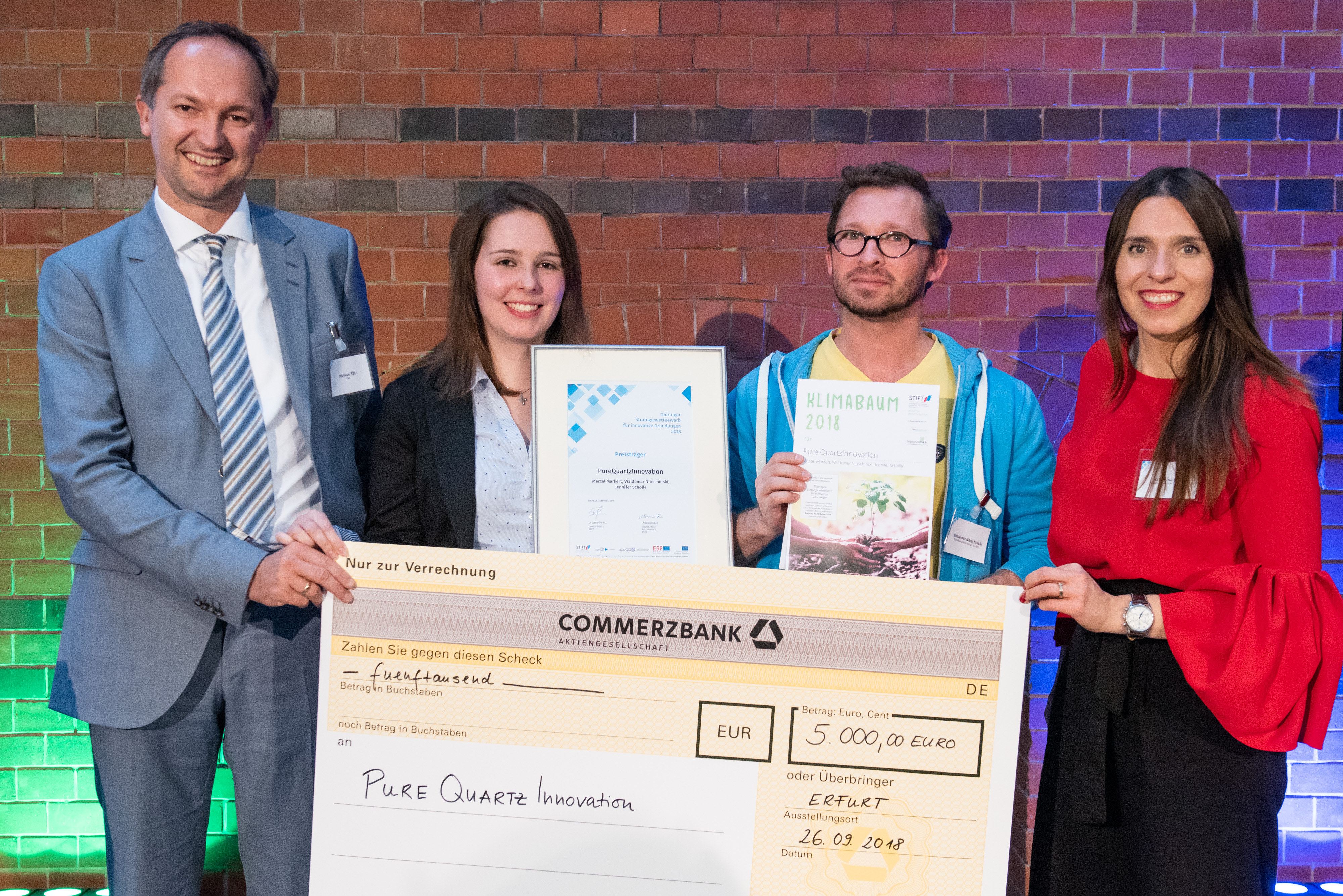 Zu den diesjährigen Preisträgern gehört PureQuartzInnovation, ein EXIST-Gründungsprojekt der Ernst-Abbe-Hochschule Jena. Die drei Gründer, Marcel Markert, Jennifer Scholle und Waldemar Nitischinski, erhielten 5.000 Euro für den Unternehmensaufbau und die Weiterentwicklung ihres Geschäftskonzepts.
