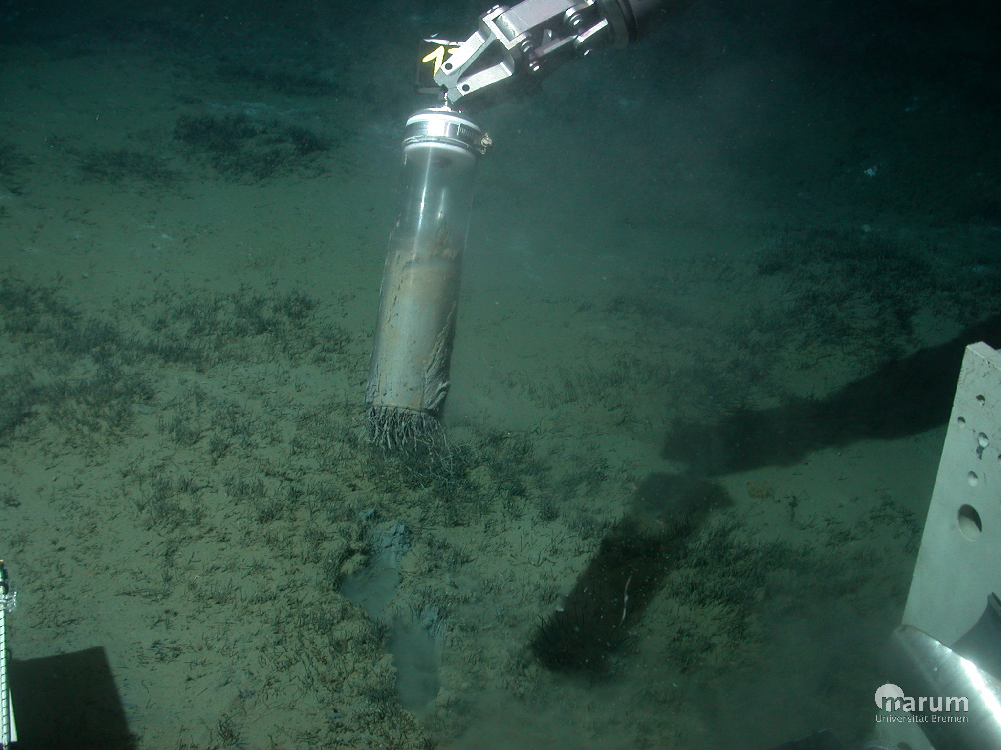 Håkon Mosby is a very flat mud volcano with a maximum height of ten meters. Surrounding the crater are three distinct circular zones: the center, the middle and the outer ring. Entirely different communities inhabit these three zones, yet they have one thing in common: methane is the main food source of the organisms on site. Most of the gas is consumed in the outer zone, which can be explained as follows: In the central and middle zone large quantities of methane are available, however there is a lack of oxygen or sulfate required to oxidize the methane. In the outer zone, the situation is different: Tubeworms, which grow up to 60 cm deep into the seafloor, actively pump seawater and thereby sulfate into deeper layers of the sediment. Thanks to these “living pumps”, organisms living at their “roots” can use methane even in regions where that normally wouldn’t be possible. There, hardly any gas escapes to the water column. This clearly shows how the complex interaction of communities on and in the ocean floor is a prerequisite for the development of an efficient biological filter for a greenhouse gas.