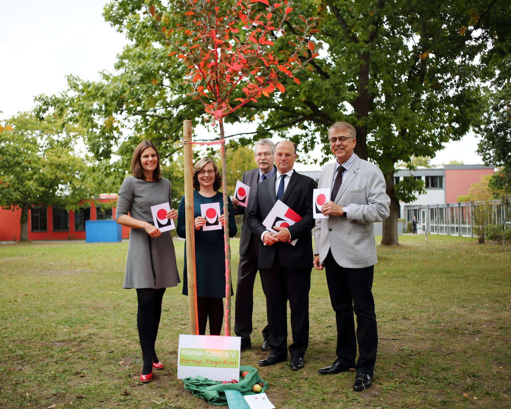 Anschließend pflanzten Präsidentin Helbig, Staatssekretär Grundei, Prof. von Grünberg und die BWL-Studentin Katja Müller symbolischen einen Apfelbaum. Als Studierendenvertreterin und letzte Rednerin hatte Katja Müller den Gästen erläutert, was es heißt als Studentin an einer TH zu studieren. Sie betonte, ihr sei eher besonders die bekannte Qualität der akademischen Ausbildung und die verstärkte Praxisorientierung wichtiger als die Reputation über ein TH-Abschlusszeugnis.