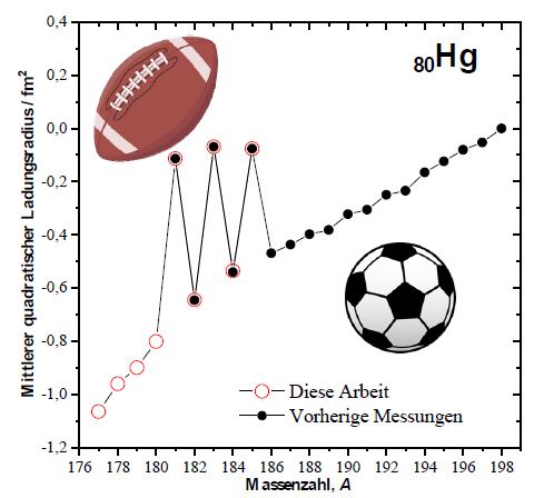 In den 1970er Jahren wurde bei Vermessungen der optischen Spektren der Elektronen in der Atomhülle bestimmter Quecksilberisotope beobachtet, dass sich die Kerngröße sprunghaft verändert. Ihre Kernform wechselt nämlich als Funktion der Massenzahl A zwischen leicht abgeplattet und ähnlich einem Rugby-Ball hin und her. Das auffällige Verhalten wurde unterhalb von A = 186 gefunden. Bei A = 185 beobachtete man einen großen Sprung im Kernradius. Dieses Verhalten wiederholte sich bei den beiden nächstkleineren ungeradzahligen Isotopen mit A = 183 und 181, während die geradzahligen Isotope mit A = 184 und 182 dem allgemeinen Trend folgten.