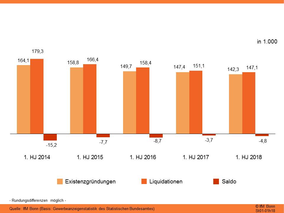 Im ersten Halbjahr 2018 ist die Zahl der Unternehmensaufgaben im Vergleich zu den ersten 6 Monaten 2017 weiter gesunken: Von 151.100 auf 147.100. Trotz der rückläufigen Entwicklung bei den gewerblichen Unternehmensschließungen bleibt der sogenannte "Gründungssaldo" – die Differenz aus Gründungen und Schließungen – negativ, da zugleich der rückläufige Trend bei den gewerblichen Existenzgründungen anhält.