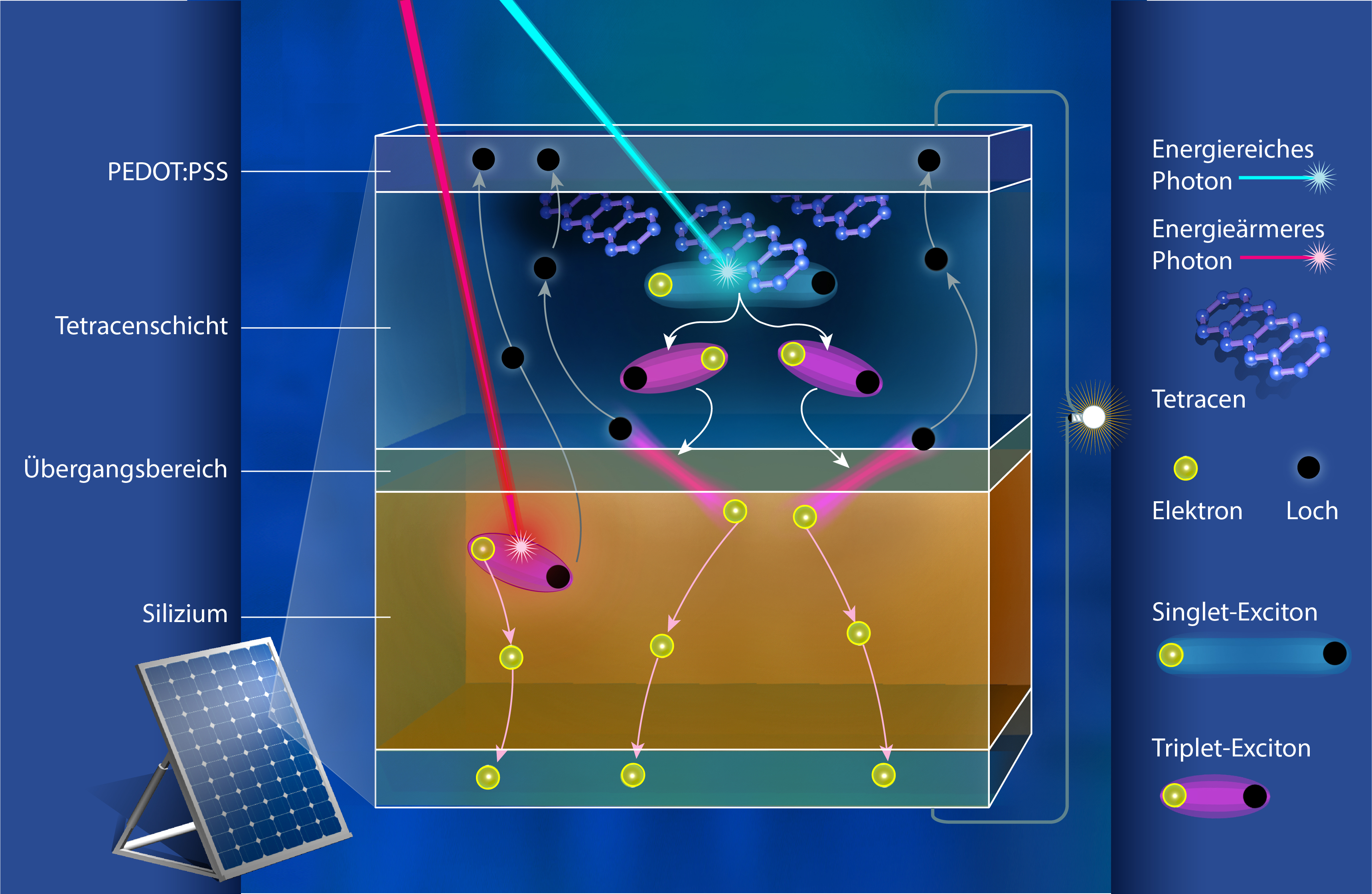 Der Wirkungsgrad einer Solarzelle ist eine ihrer wichtigsten Kenngrößen. Er gibt an, wieviel Prozent der eingestrahlten Sonnenenergie in elektrische Energie umgewandelt wird. Die theoretische Grenze für Silizium-Solarzellen liegt aufgrund physikalischer Materialeigenschaften bei 29,3 Prozent. Im Fachjournal Materials Horizons beschreiben Forscher des Helmholtz-Zentrum Berlin (HZB) zusammen mit internationalen Kollegen, wie diese Grenze aufgehoben werden kann. Der Trick: sie bauen organische Schichten in die Solarzelle ein. Diese wandeln die Energie der hochenergetischen Photonen (grünes und blaues Licht) so um, dass sich die Stromausbeute in diesem Energiebereich verdoppelt.