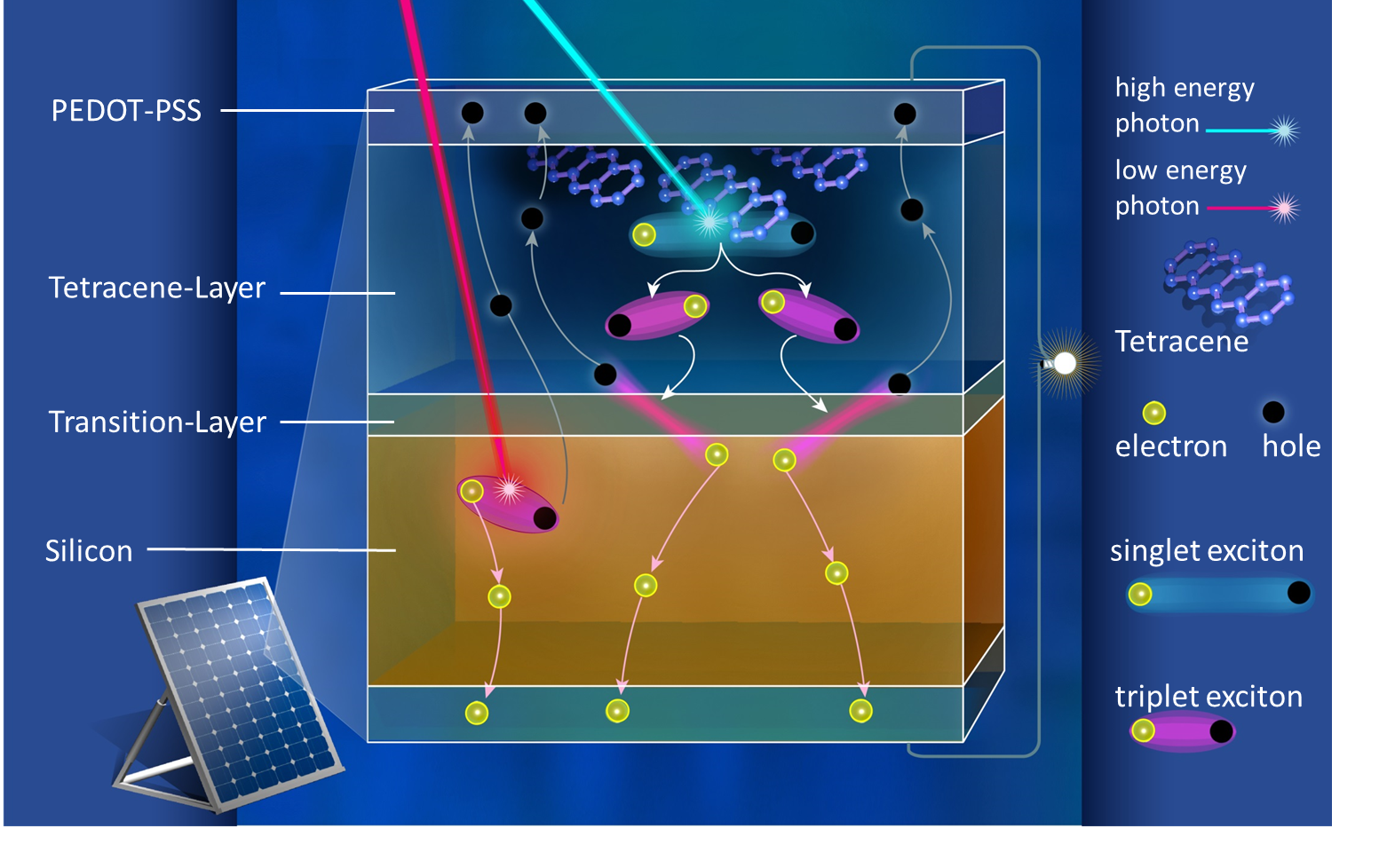 These triplet excitons are quite durable and very strongly bound together. The challenge was to split apart them at an interface to silicon. This unbinds the positive and negative charge carriers, permitting them to contribute to the solar cell’s current.
