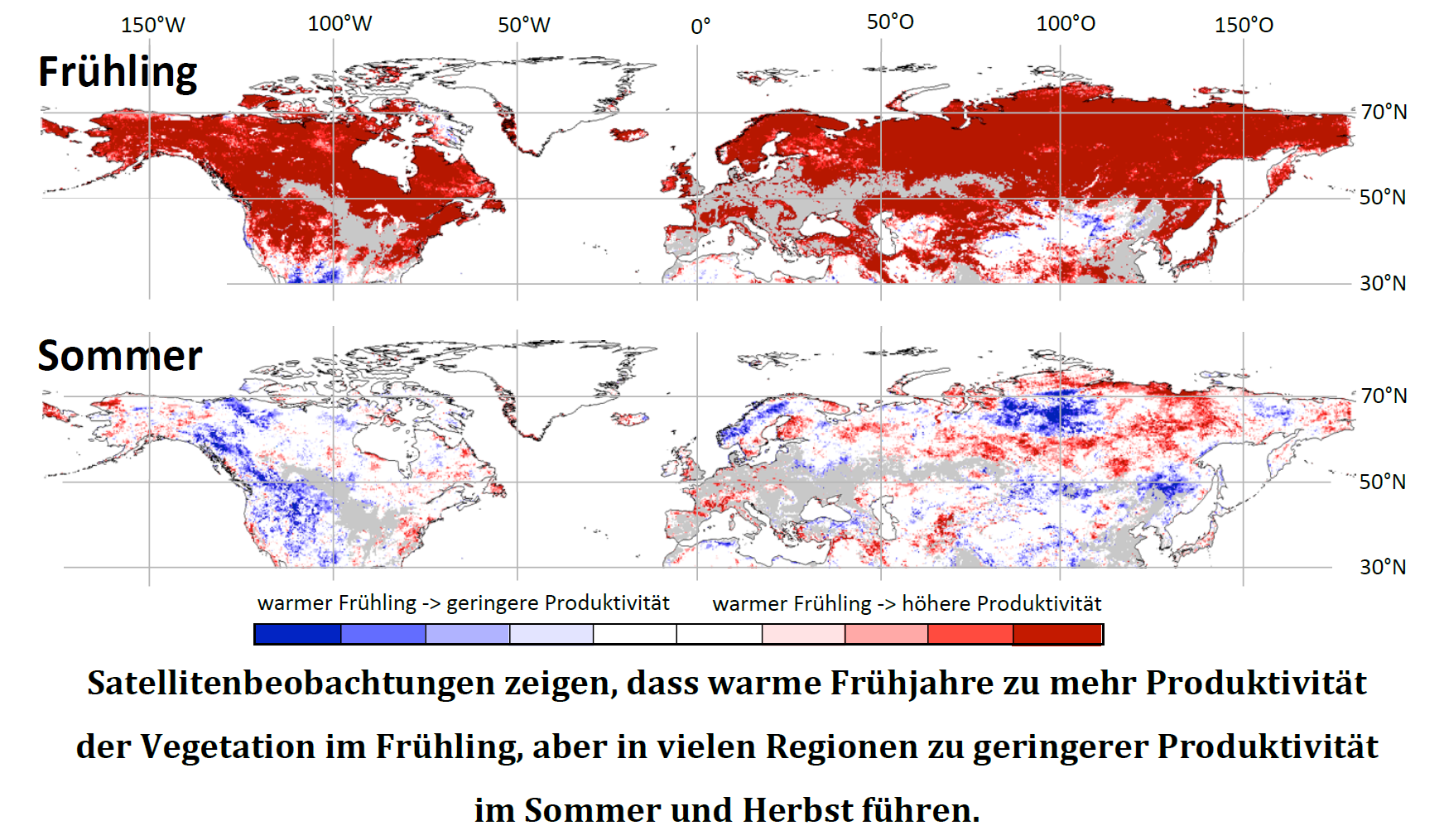 Wenn das Frühlingswetter früher beginnt, liegt die Vermutung nahe, dass die Pflanzen länger Zeit zum Wachsen haben, mehr Biomasse produzieren und somit Kohlenstoff aus der Atmosphäre binden. Doch das ist nicht der Fall: Die Daten zeigen zwar, dass die Nordhalbkugel bei warmem Frühling tatsächlich grüner wird. Doch dieser Effekt kann sich im Sommer und im Herbst umkehren, sodass insgesamt durch die Erwärmung sogar weniger Kohlenstoff aus der Atmosphäre entzogen wird.