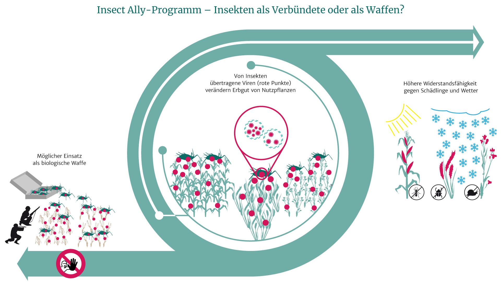 Während die erschreckende Wirkung von Chemiewaffen durch die bewaffneten Konflikte der Gegenwart in der öffentlichen Wahrnehmung präsent ist, sind biologische Waffen und ihre Wirkung weitgehend aus dem Blickfeld der Öffentlichkeit verschwunden. Ein Forschungsprogramm der Forschungsbehörde des amerikanischen Verteidigungsministeriums weckt nun die Befürchtung, dass Forschung zur biologische Kriegsführung missbraucht werden könnte. In dem Projekt namens Insect Allies („Alliierte/Verbündete Insekten“) sollen Insekten als Transportmittel für Pflanzenviren dienen und diese auf landwirtschaftliche Nutzpflanzen übertragen. Die Viren können das Erbgut der betroffenen Pflanzen mittels sogenannter Genomeditierung verändern. Auf diese Weise ließen sich bereits auf den Feldern wachsende Pflanzen wie Mais oder Tomaten schnell und in großem Stil genetisch verändern. Wissenschaftler des Max-Planck-Instituts für Evolutionsbiologie in Plön sowie der Universitäten Freiburg und Montpellier weisen im Fachmagazin Science darauf hin, dass ein solches System relativ leicht manipuliert und als biologische Waffe eingesetzt werden kann.