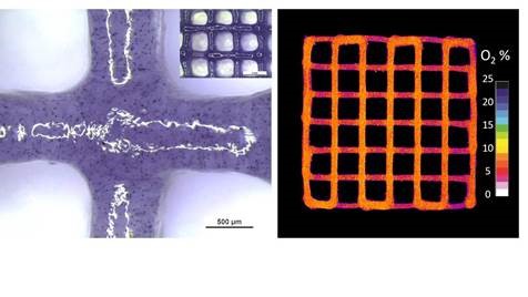 Forscher arbeiten weltweit intensiv an der Entwicklung von Methoden des Bioprinting, also dem 3D-Druck von in Biomaterialien eingebetteten Zellen, mit dem Ziel, menschliche Gewebe künstlich herzustellen. Problematisch dabei ist die Versorgung der Zellen im Inneren solcher Konstrukte; ein Mangel zum Beispiel an Sauerstoff führt zu deren schnellen Absterben. Ein Forscherteam der TU Dresden um Prof. Michael Gelinsky (Dr. Ashwini Rahul Akkineni, Dr. Anja Lode und Dr. Felix Krujatz) entwickelte gemeinsam mit Kollegen von der Universität Kopenhagen (Prof. Michael Kühl und Mitarbeiter) eine neue Methode, die eine zerstörungsfreie Messung der lokalen Sauerstoffkonzentration in solchen künstlichen Geweben erlaubt. Damit kann erstmals online der Sauerstoffgehalt in der unmittelbaren Umgebung solcher Zellen über die Zeit ermittelt werden. Diese Methode erlaubt auch die Untersuchung des Sauerstoffverbrauchs durch die Zellen – je vitaler und aktiver die Zellen sind, umso mehr Sauerstoff verbrauchen sie. Zellen der Bauchspeicheldrüse, die Insulin produzieren, oder sich zu Knochenzellen differenzierende Stammzellen haben beispielsweise einen sehr hohen Sauerstoffverbrauch.