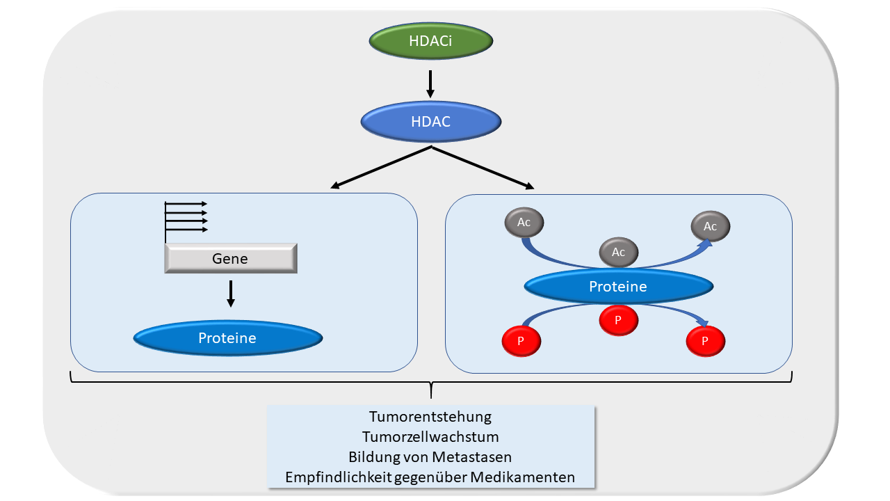 Die Abbildung zeigt HDAC-Inhibitoren und ihre therapeutische Zielstruktur HDAC. Eine Hemmung der HDACs kann die Ableserate von Genen durch eine veränderte Anheftung von Acetylresten (Ac) an Proteine modulieren. Durch diese Veränderung der Genmuster ändern sich Proteinmengen in Zellen. HDACs kontrollieren jedoch nicht nur Proteine, die Gene regulieren, sondern sehr viele andere, für das Überleben von Zellen wichtige Proteine. So kann die Anheftung der Acetylreste zum Beispiel das Anheften von Phosphatgruppen (P) an Proteine beeinflussen und dadurch weitere Proteinfunktionen modulieren. Durch derartige Veränderungen von Proteinfunktionen kann das Schicksal von Tumorzellen verändert werden. Ein wesentliches Ziel ist es, deren Wachstum und Ausbreitung mit HDAC-Inhibitoren zu unterbinden.