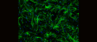 Bildunterzeile: In der Kulturschale entstandene Astrozyten, angefärbt für den Astrozyten-spezifischen Marker Glial Fibrillary Acidic Protein (GFAP) und den Kernfarbstoff DAPI.
