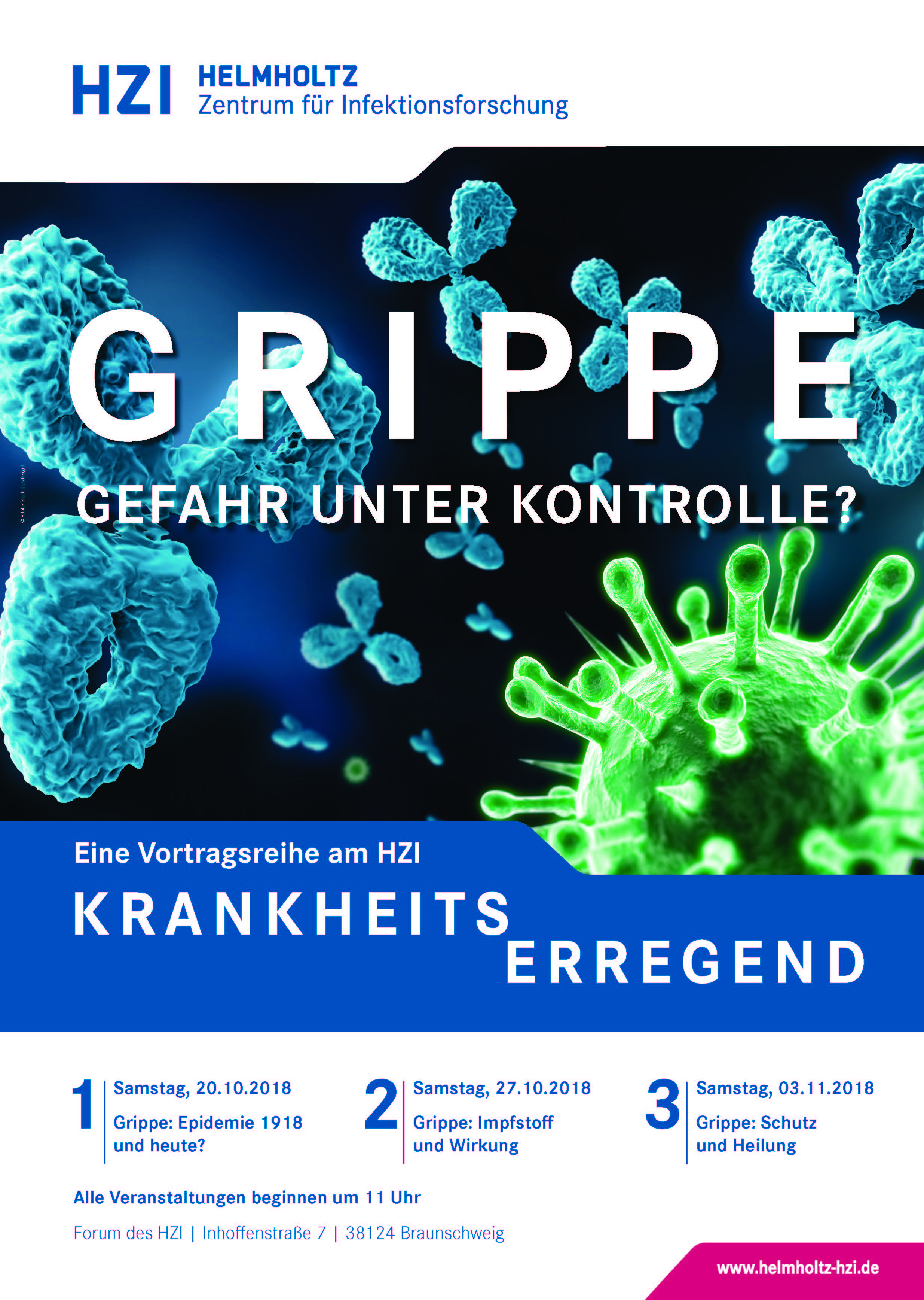 Bei der diesjährigen Ausgabe der Vortragsreihe „KrankheitsErregend“ werden ganz verschiedene Aspekte der Grippe beleuchtet: Am HZI informieren Experten an drei Samstagvormittagen darüber, was Sie tun können, um gesund zu bleiben, und wie genau die neuesten Medikamente im Krankheitsfall wirken. Ebenso stehen die Entwicklung und Wirkweise von Impfstoffen und der aktuelle Stand der Grippeforschung im Fokus. Am 27. Oktober 2018 geht es um Impfstoffe und Impfforschung und am 3. November 2018 um die vielfältigen Möglichkeiten, wie Sie sich vor einer Ansteckung schützen können und welche Therapiemöglichkeiten im Krankheitsfall zur Verfügung stehen.