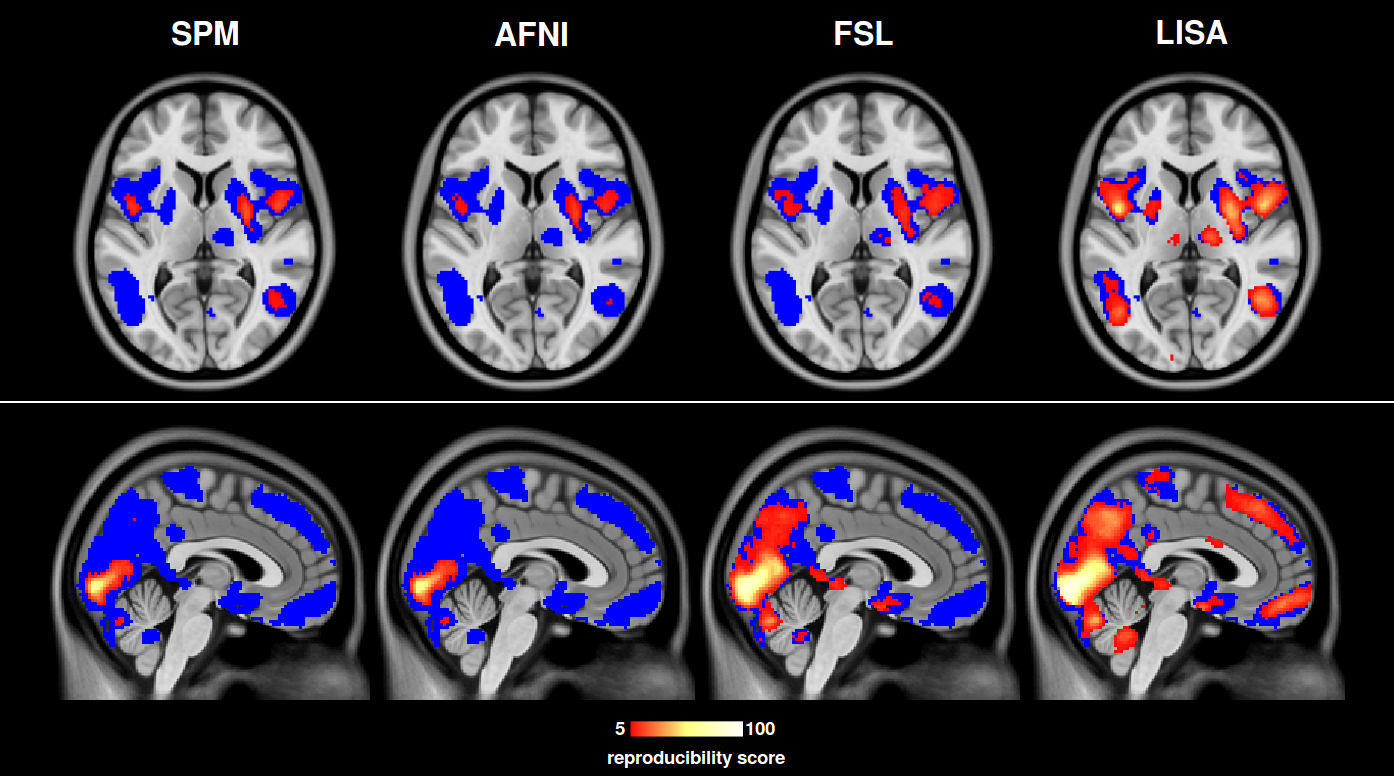 Picture caption: This image shows a comparison of LISA against the most commonly used other statistical inference algorithms. Brain activations detected by LISA are better reproducible and are thus more reliable."