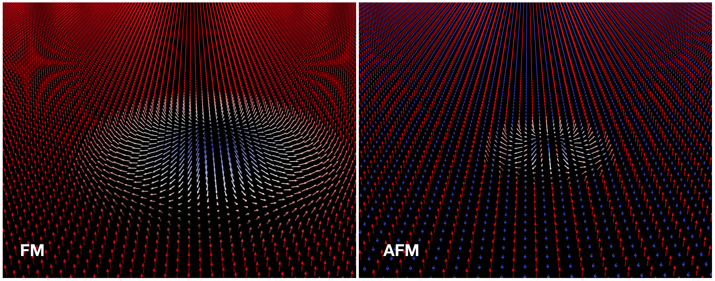 Ein magnetisches Skyrmion könnte zukünftig als ein magnetisches Bit in der Datenspeicherung für eine „1“ stehen. Das Skyrmion besteht aus einer besonderen Anordnung der magnetischen Momente benachbarter Atome, in den Bildern durch Pfeile repräsentiert. Besitzt das Skyrmion eine „Tarnkappe“, weil benachbarte magnetische Momente nahezu entgegengesetzt sind und das magnetische Streufeld verringern, so lassen sich kleinere Skyrmionen stabilisieren, so wie in der Abb. rechts gezeigt. Physiker sprechen von „antiferromagnetischer“ (AFM) statt „ferromagnetischer“ (FM) Ordnung von Momenten an benachbarten Atomen.