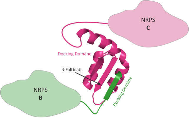 Bildtext: 3D-Struktur eines NRPS Docking Domänen Paares. Die Docking-Domäne von NRPS B (grün) bindet über ein β-Faltblatt an die passende Docking-Domäne von NRPS C (magenta).
