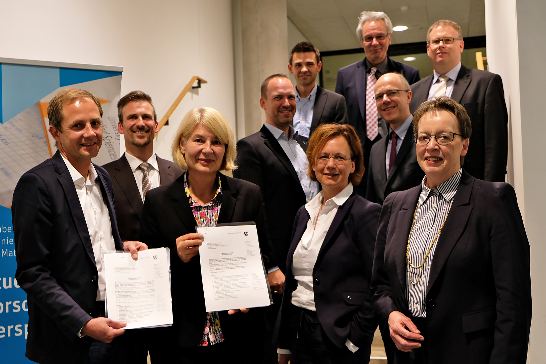 Bielefeld/Gütersloh (fhb). Die Digitalisierung nutzen, um Kostensenkungen und schnellere Abläufe in der Produktion zu erreichen und zudem die Umsetzung neuer Geschäftsmodelle in Angriff zu nehmen: Dafür erhält jetzt das Center for Applied Data Science (CfADS) der Fachhochschule (FH) Bielefeld am Campus Gütersloh zusätzlich drei Millionen Euro im Rahmen des Förderwettbewerbs „Forschungsinfrastrukturen“ des Landes Nordrhein-Westfalen. Die Mittel werden je zur Hälfte vom Land NRW und aus dem Europäischen Fonds für regionale Entwicklung (EFRE) zur Verfügung gestellt. Die Detmolder Regierungspräsidentin Marianne Thomann-Stahl überreichte heute (22.10.2018) der Präsidentin der FH Bielefeld, Professorin Dr. Ingeborg Schramm-Wölk, den Zuwendungsbescheid für die Hochschule. Es ist bereits die zweite Förderung, die die FH Bielefeld im Rahmen des Wettbewerbs „Forschungsinfrastrukturen“ für das CfADS erhält.