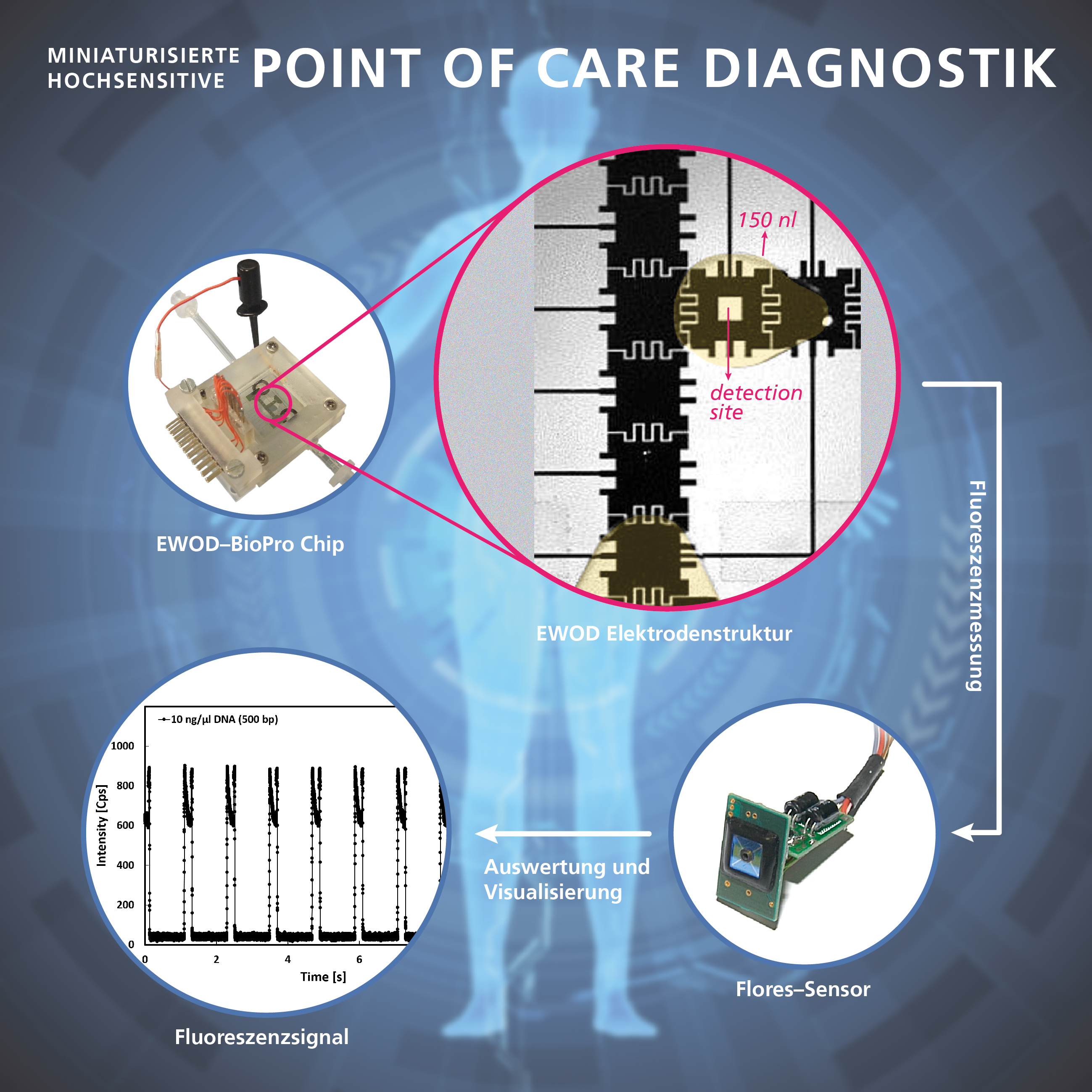 Herkömmliche Laboruntersuchungen liefern nicht nur weniger Informationen. Sie benötigen auch wesentlich größere Probenmengen und dauern länger, ein enzymatisches Assay beispielsweise rund 15 – 20 Minuten. Das EWOD-BioPro System liefert hingegen bereits in einer halben Minute ein Ergebnis. Das System ist außerdem prädestiniert für den Einsatz im Bereich der sogenannten Point-of-Care-Diagnostik, also für diagnostische Untersuchungen, die nicht in einem Zentrallabor, sondern vor Ort am Klinikbett oder in der Arztpraxis durchgeführt werden.