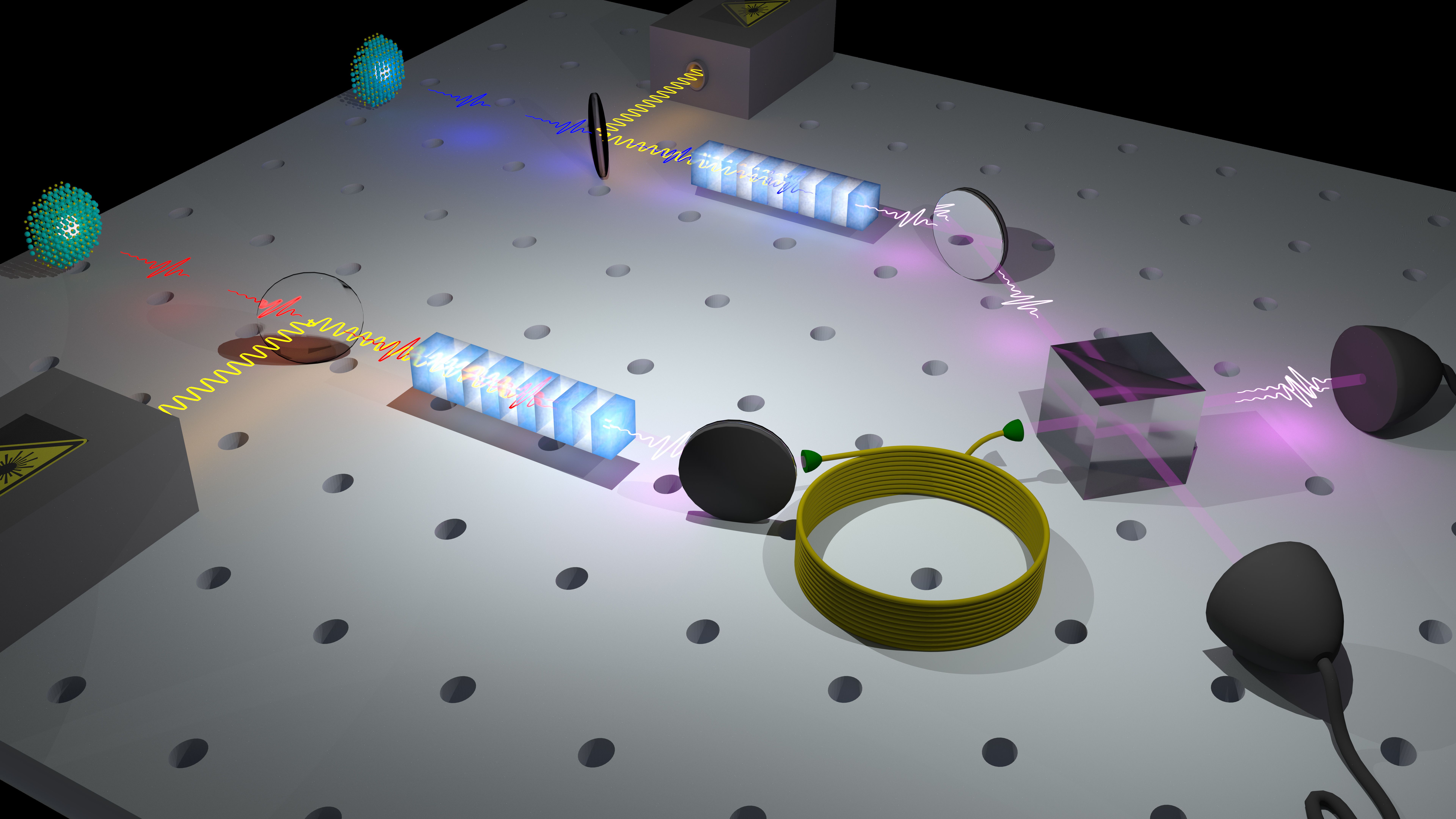 Die gängigen Nanostrukturen, auch Quantenpunkte genannt, senden jedoch meist Lichtteilchen aus, deren Wellenlänge nicht auf die Übertragung mit Glasfasern angepasst ist. Um die vielen Vorzüge von Quantenpunkten dennoch nutzbar zu machen, wurden von der Arbeitsgruppe Quantenoptik um Prof. Christoph Becher der Universität des Saarlandes zwei unabhängige Quanten-Frequenzkonverter aufgebaut. Diese Konverter enthalten spezielle Kristalle. Überlagert man in ihnen die einzelnen Lichtteilchen mit starkem Laserlicht, so kann deren Wellenlänge manipuliert werden. „Erst dann können die Lichtteilchen über die angepeilten 10-100 km Glasfaserstrecke übertragen werden. Ohne diese Vorbereitung müsste man in 1-km-Abständen Signalverstärker aufbauen. Das wäre wohl nicht realisierbar“, meint Benjamin Kambs, der als Doktorand in der Arbeitsgruppe von Prof. Becher maßgeblich an der Entwicklung der beiden Frequenzkonverter beteiligt war.